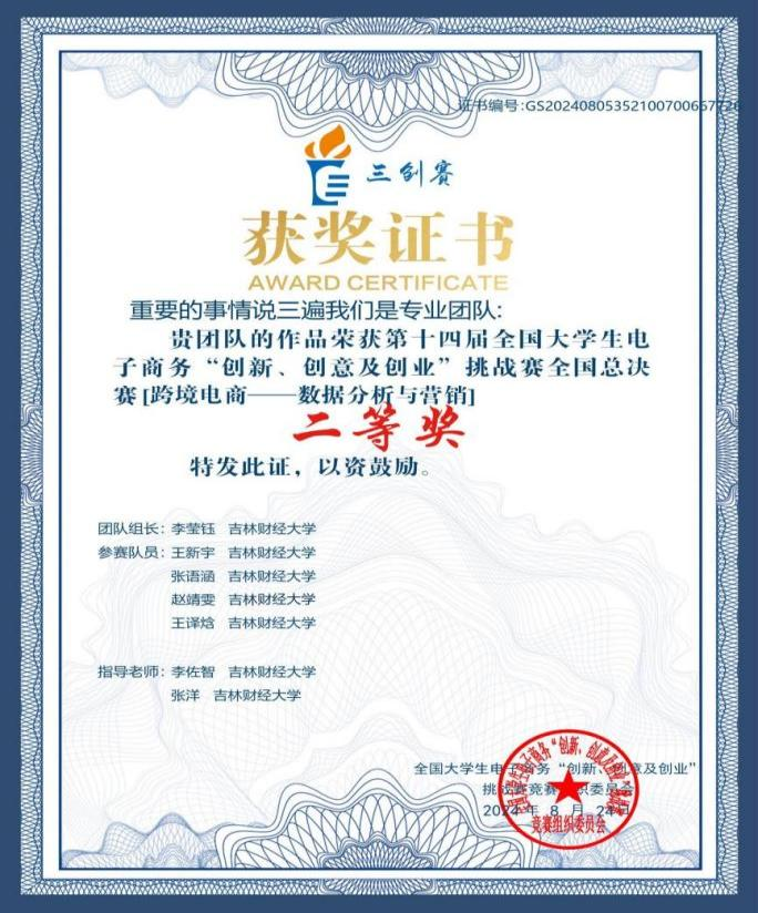 在跨境电商实战赛全国总决赛中,由kaiyun官网国际经济贸易学院教师张洋、李佐智指导,国际经济贸易学院李莹钰、张语涵、赵靖雯、王译焓与金融学院王新宇组成的团队,凭借《风华再现,织锦千秋——基于细粒度情感分析视角下跨境电商女装品类评论数据洞察与数字营销实践探索》项目荣获实战赛“跨境电商-数据分析与营销”赛道全国总决赛二等奖。该项目主要采用先进的消费者情感分析技术与数字营销策略,旨在助力中国女装品牌成功拓展国际市场。在竞赛过程中,该项目获得了广泛赞誉,并在竞赛结束后吸引了多家浙江省本土跨境电商企业的合作意向。