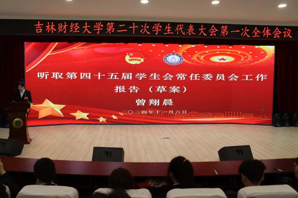 第一次全体会议上,学校第二十次学生代表大会主席团成员王拓,受委托代表第四十五届学生会向大会作题为《立足时代砥砺奋发书写中国式现代化挺膺担当的青春篇章在矢志奋斗中谱写新时代青春之歌》的工作报告。学校第二十次学生代表大会主席团成员曾翔晨,受委托代表第四十五届学生代表大会常设机构向大会作《第四十五届学生代表大会常任委员会工作报告(草案)》。