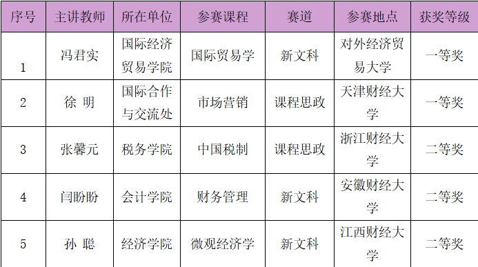 本届大赛以“数智赋能”为主题,分为“课程思政”和“新文科”两个赛道,采用初赛、复赛和决赛三级赛制,共评选一、二、三等奖。经过激烈角逐,国际经济贸易学院冯君实、国际交流与合作处徐明荣获一等奖,税务学院张馨元、会计学院闫盼盼、经济学院孙聪荣获二等奖。尤为值得一提的是,国际经济贸易学院冯君实老师在《国际贸易学》课程新文科赛道的激烈竞争下,勇夺桂冠,决赛成绩位列赛道第一。