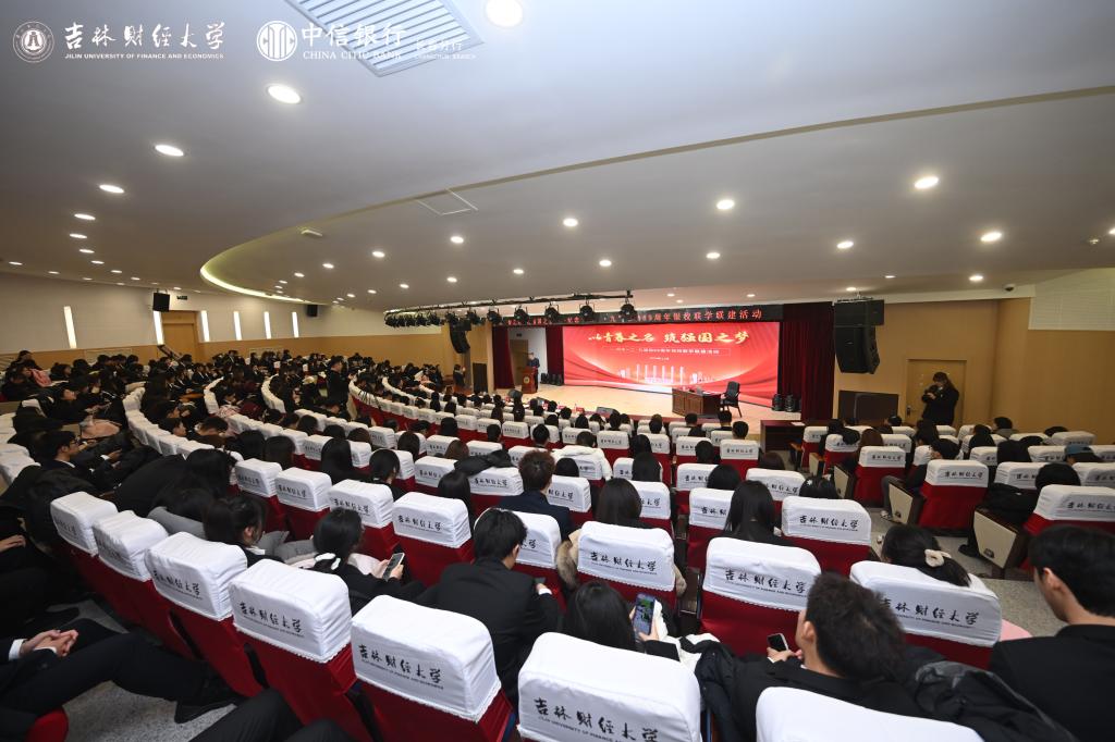 中信银行长春分行人力资源部党支部书记、总经理孙琪,人力资源部党委组织部专家郭德辉,政府与机构客户部党支部书记、团委书记王冬雪,学校相关职能部门、全体团干部、中信银行长春分行毕业校友和在校学生参加了活动。(审核人 孙之光)
