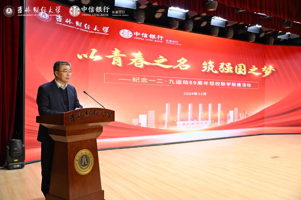 刘晓峰在讲话中表示,在纪念一二·九运动 89 周年这特殊的日子回到母校,共同举办这场意义重大的纪念活动,心潮澎湃、感慨万千;他结合自己的工作经历分享了“奋斗需要平台”和“成事需要校友”的深刻感悟;他希望能与母校在银校合作、产学研用、人才培养等方面创造更多机会,以吉财学子之合力,一同为金融强国事业作出更大贡献。