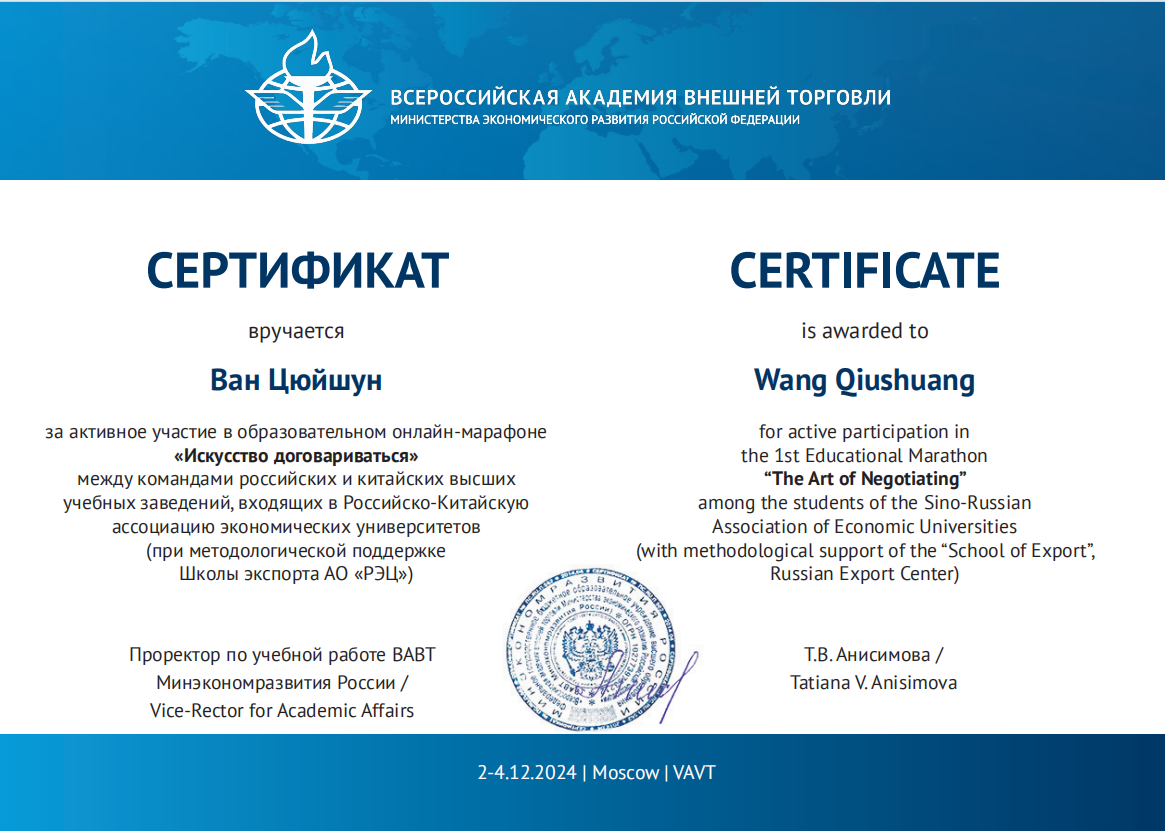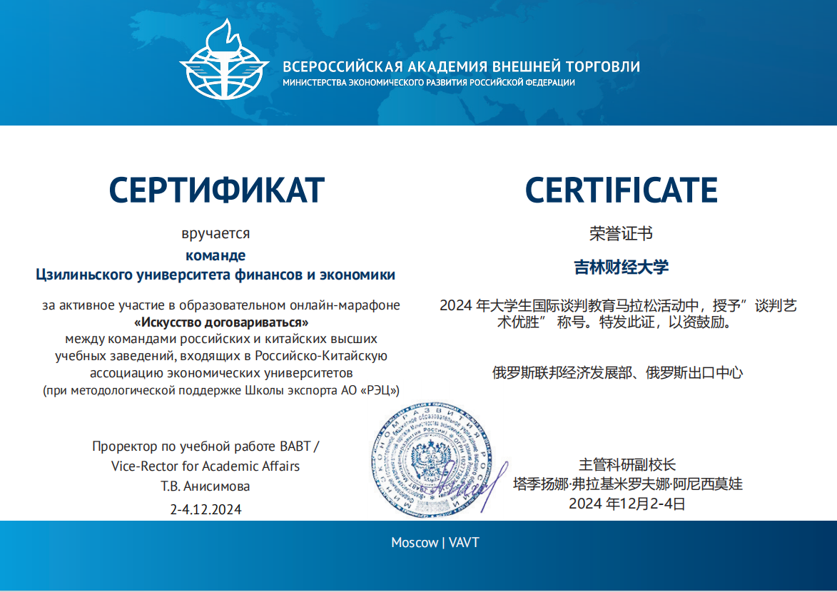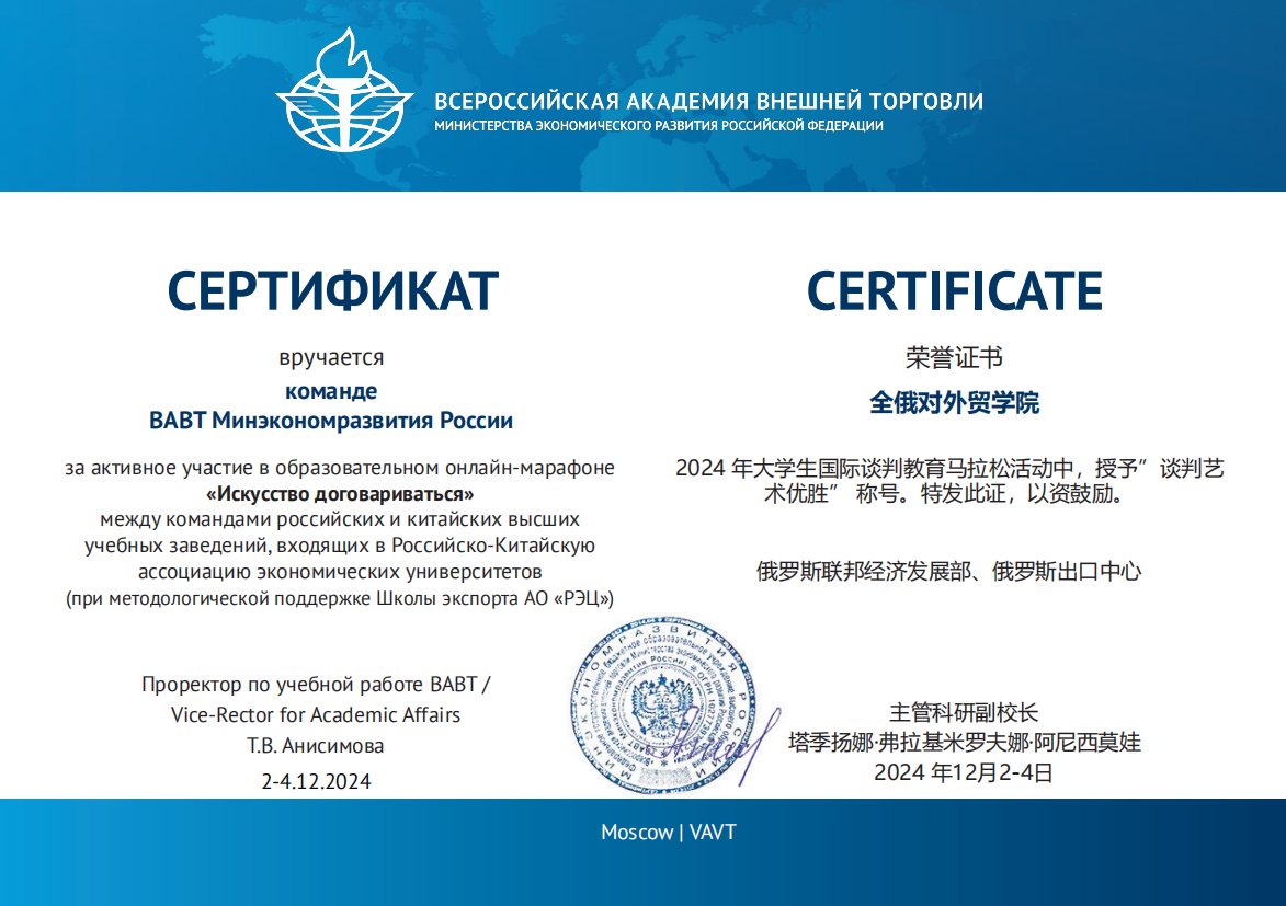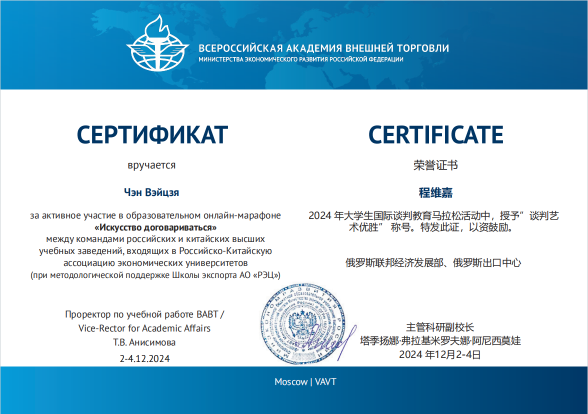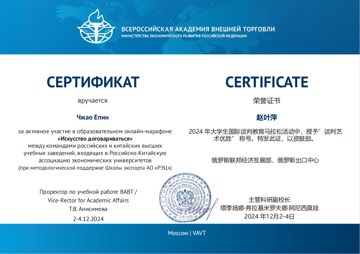 中俄经济类大学联盟教育马拉松“谈判的艺术”是一项集学术性、实践性于一体的国际交流赛事,由俄罗斯联邦经济发展部全俄外贸学院主办。本次比赛,kaiyun官网在国际经济贸易学院教师刘蕴喆的指导下,选派了3支代表队参加中、英文两个赛道,其中在俄罗斯全俄对外经贸学院交换学习的国际经济贸易学院本科生陈承、曾雪蒙、杨颖3名同学在主赛场参加线下中文赛道;国际经济贸易学院研究生赵叶萍、程维嘉、范曦文、苏怡参加线上中文赛道;国际经济贸易学院本科生王秋霜、张语涵、刘至立及金融学院的王建业参加线上英文赛道。
