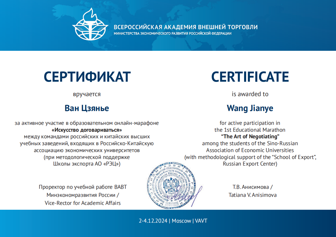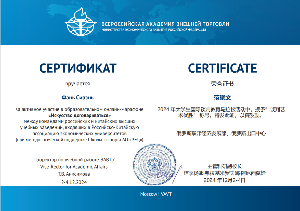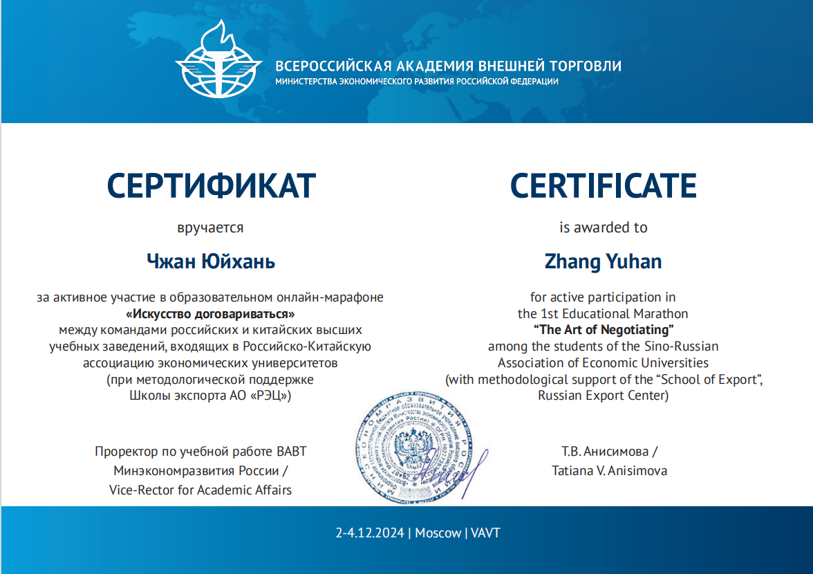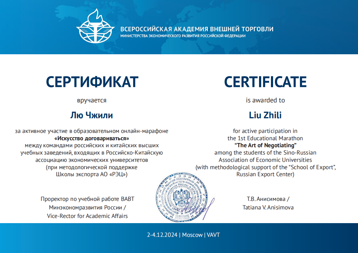 中俄经济类大学联盟教育马拉松“谈判的艺术”是一项集学术性、实践性于一体的国际交流赛事,由俄罗斯联邦经济发展部全俄外贸学院主办。本次比赛,kaiyun官网在国际经济贸易学院教师刘蕴喆的指导下,选派了3支代表队参加中、英文两个赛道,其中在俄罗斯全俄对外经贸学院交换学习的国际经济贸易学院本科生陈承、曾雪蒙、杨颖3名同学在主赛场参加线下中文赛道;国际经济贸易学院研究生赵叶萍、程维嘉、范曦文、苏怡参加线上中文赛道;国际经济贸易学院本科生王秋霜、张语涵、刘至立及金融学院的王建业参加线上英文赛道。