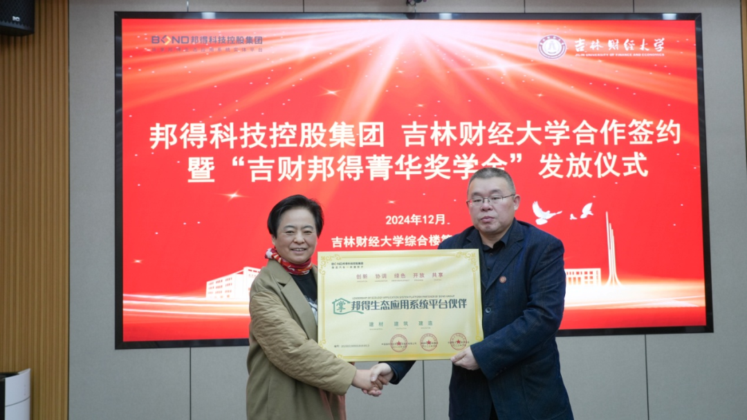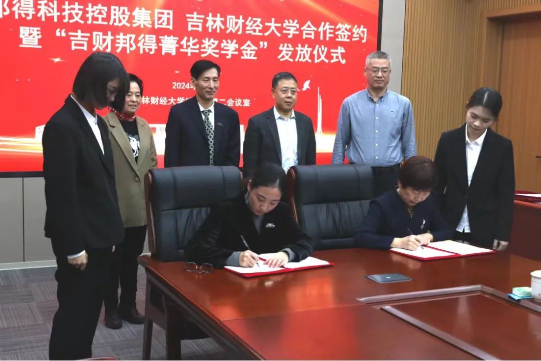 本网讯(校友工作办公室 供稿)2024年12月30日,学校与邦得科技控股集团举行校企合作签约暨“吉财邦得菁华奖学金”发放仪式。党委副书记、校长童猛,党委副书记刘鹤,副校长王菁华,邦得科技控股集团副董事长兼金融板块总经理、学校七八级校友崔少华,集团执行董事兼康养板块总经理赵建榕,集团董事长助理兼教育板块总经理孙东梅,集团先丰低碳传媒副总监孙小琼等出席仪式。仪式由刘鹤主持。