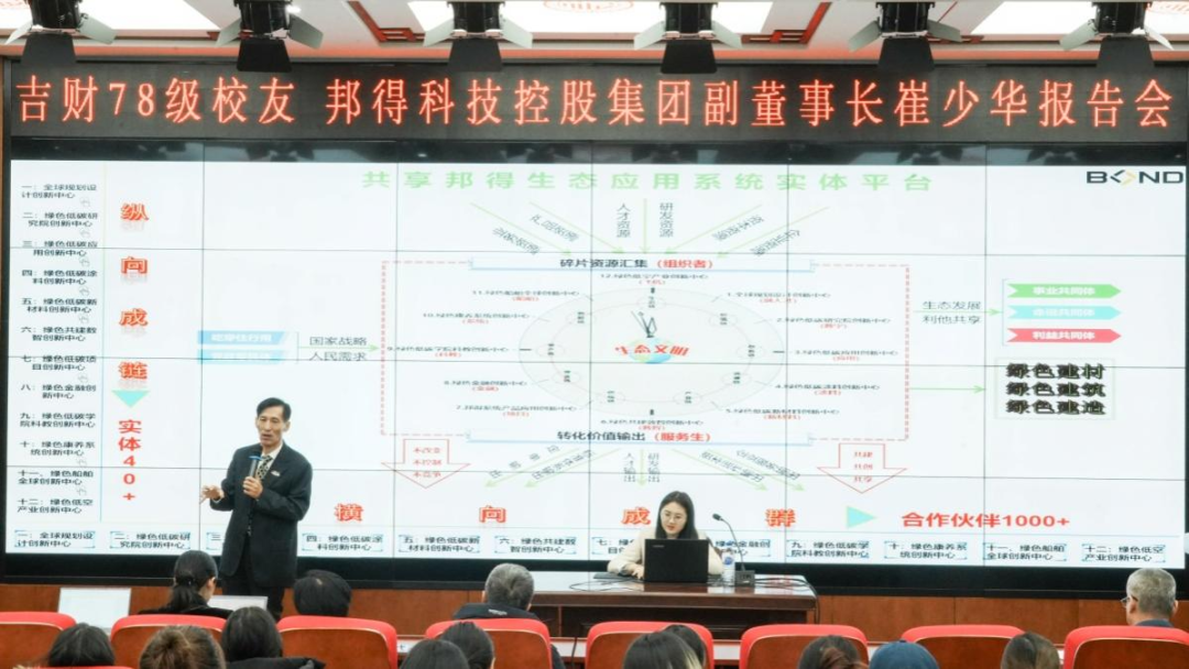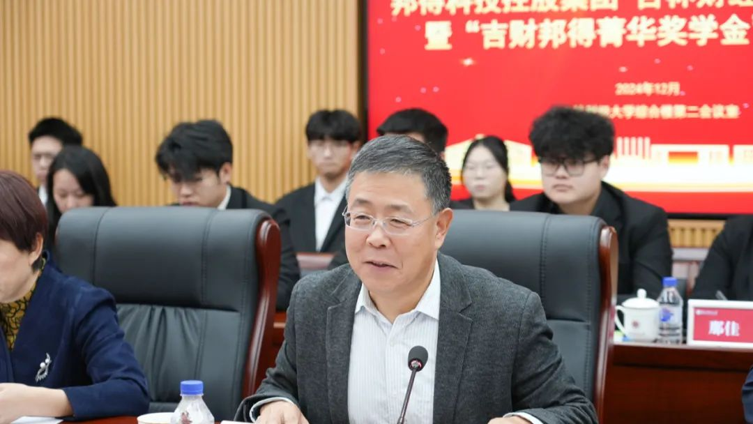 崔少华介绍了邦得集团基本情况、集团设立“吉财邦得菁华奖学金”的初衷,阐释了绿色低碳高质量发展的重要性,并分享了邦得集团在推动绿色转型和构建人类命运共同体方面的实践与探索。崔少华希望校企双方在合作中优势互补,深度融合,共同培育满足未来社会发展需求的高素质人才,开启长期合作、互利共赢的新篇章。