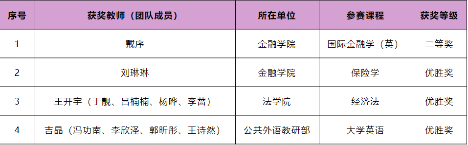 本网讯(教师教学发展中心 供稿)近日,“超星杯”第六届全国高校混合式教学设计创新大赛在西安电子科技大学落下帷幕。kaiyun官网报送的参赛课程全部获奖,获奖数量再创新高,获奖范围也实现了从财经学科向基础学科的拓展。金融学院戴序主讲课程《国际金融学(英)》荣获二等奖,金融学院刘琳琳主讲课程《保险学》、法学院王开宇主讲课程《经济法》、公共外语教研部吉晶主讲课程《大学英语》荣获优胜奖。