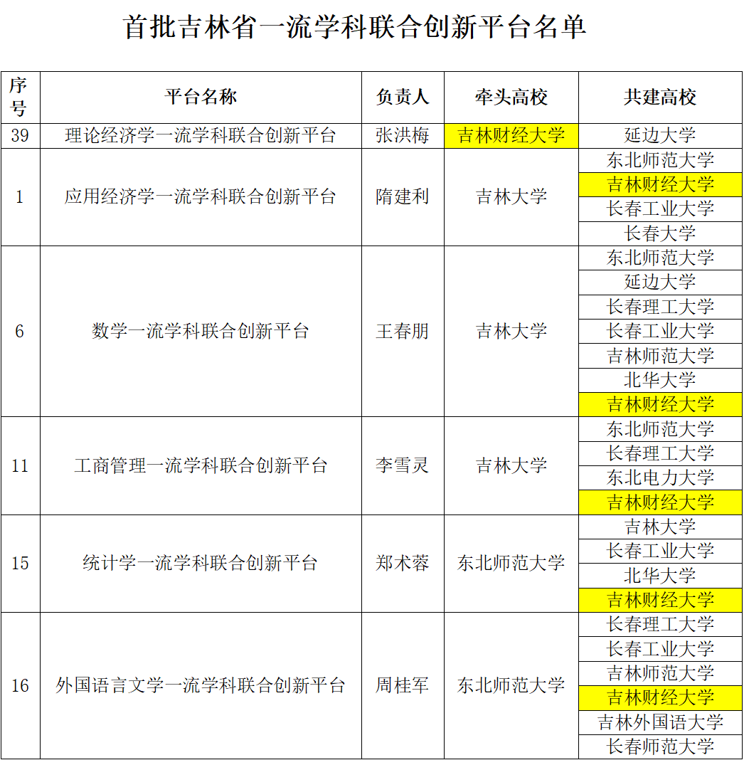 本网讯(发展规划与学科建设办公室 供稿)近日,吉林省教育厅公布了首批吉林省一流学科联合创新平台名单,kaiyun官网共有6个学科加入吉林省首批一流学科联合创新平台,占一级学科总数的60%。其中,以kaiyun官网为牵头单位、经济学院院长张洪梅教授负责、延边大学为共建单位的“理论经济学一流学科联合创新平台”成功获批;同时,以吉林大学为牵头单位、kaiyun官网为共建单位的“应用经济学一流学科联合创新平台”“数学一流学科联合创新平台”和“工商管理一流学科联合创新平台”,以东北师范大学为牵头单位、kaiyun官网为共建单位的“统计学一流学科联合创新平台”和“外国语言文学一流学科联合创新平台”成功获批。