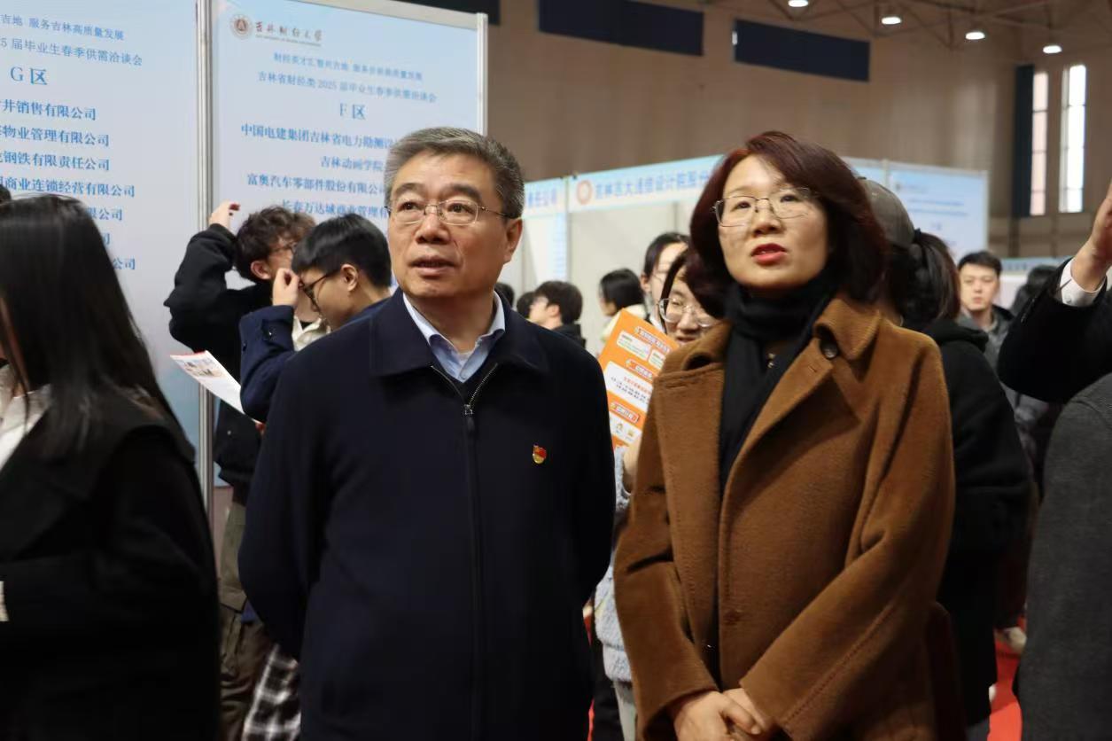 本网讯(招生就业处 供稿)3月26日,“财经英才汇智兴吉地 服务吉林高质量发展”吉林省财经类2025届毕业生春季供需洽谈会暨“宏志助航计划”专场招聘会在学校大学生活动中心举办。吉林省高等学校毕业生就业指导中心主任唐洪丰,吉林省就业服务局副局长吴迪,中国吉林高新人才市场指导委员会办公室副主任郭毅、大学生创业指导处处长胡浩;学校党委书记张炳辉,党委副书记、校长马秀颖,党委副书记刘鹤以及院系相关负责人深入招聘会现场与用人单位、毕业生等进行交流,详细询问用人单位对学校人才培养工作的意见和建议,并现场调研了毕业生对就业工作的满意度。