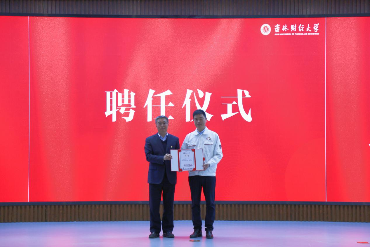 报告会开始前,由刘鹤为杨永修颁发校外兼职辅导员聘书。