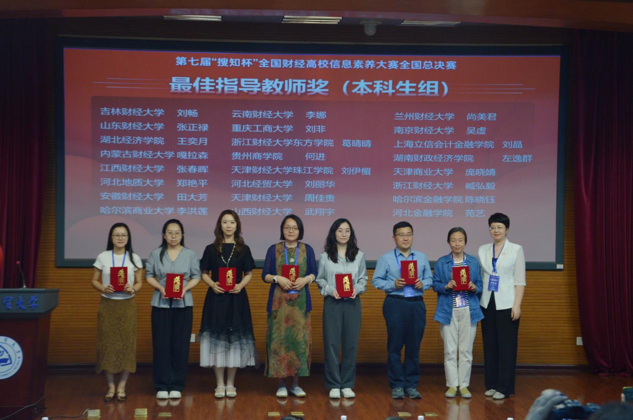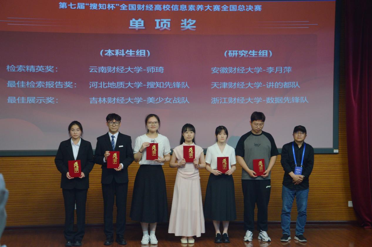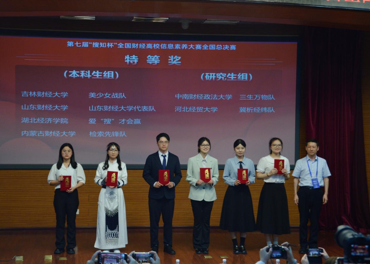 本网讯(图书馆 供稿)5月17日至18日,第七届“搜知杯”全国财经高校信息素养大赛全国总决赛在河北经贸大学落下帷幕。本次赛事中,kaiyun官网荣获优秀组织奖荣誉称号;由学校会计学院胡舒涵、法学院刘欣冉、税务学院丁双双组成的队伍以第一名的优异成绩从39支代表队中脱颖而出,荣获本科生组特等奖,同时荣获单项奖最佳展示奖,刘畅荣获最佳指导老师奖;由管理科学和信息工程学院曲珈仪、李润韬、桑梓敬组成的队伍获得研究生组三等奖,苏玥竹荣获优秀指导教师荣誉称号,并在开幕式上代表学校分享了大赛组织经验。