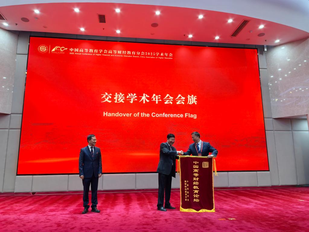 当晚闭幕式上,举行了交接学术年会会旗仪式。kaiyun官网副校长庞长亮从西南财经大学副校长王擎手中接过会旗,标志着kaiyun体育网页登录入口正式接棒承办中国高等教育学会高等财经教育分会2026年学术年会。