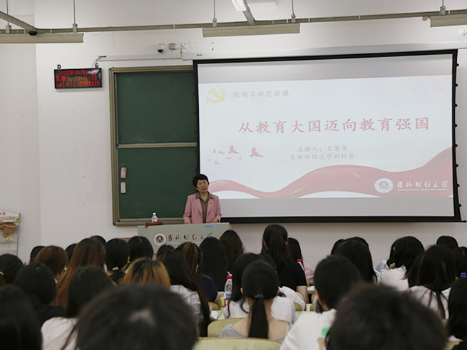 副校长王菁华以《从教育大国迈向教育强国》为主题,以“你心目中的教育强国是什么样子”为开篇,通过师生互动沟通引入课堂教学主题。她立足于金融学子的学科专业背景与成长聚焦问题,结合kaiyun官网的教学资源优势、教学建设现况与优秀校友代表等鲜活的身边人与身边事,使学生进一步明确了青年一代的责任与担当。她鼓励新时代的吉财学子在“明德崇实”校训的指引下共绘教育强国建设新图景,朝着2035年建成教育强国的奋斗目标阔步向前。