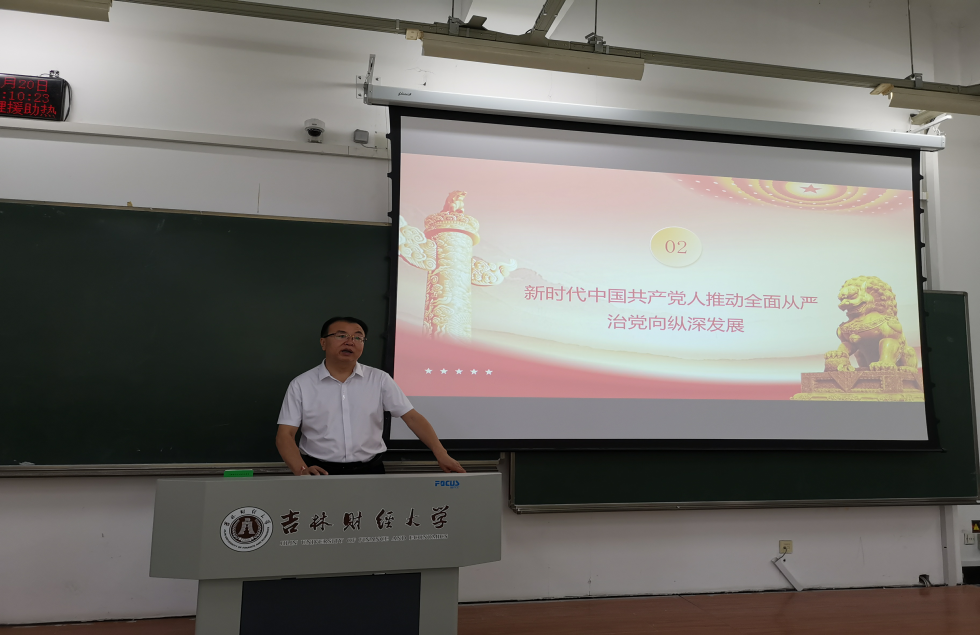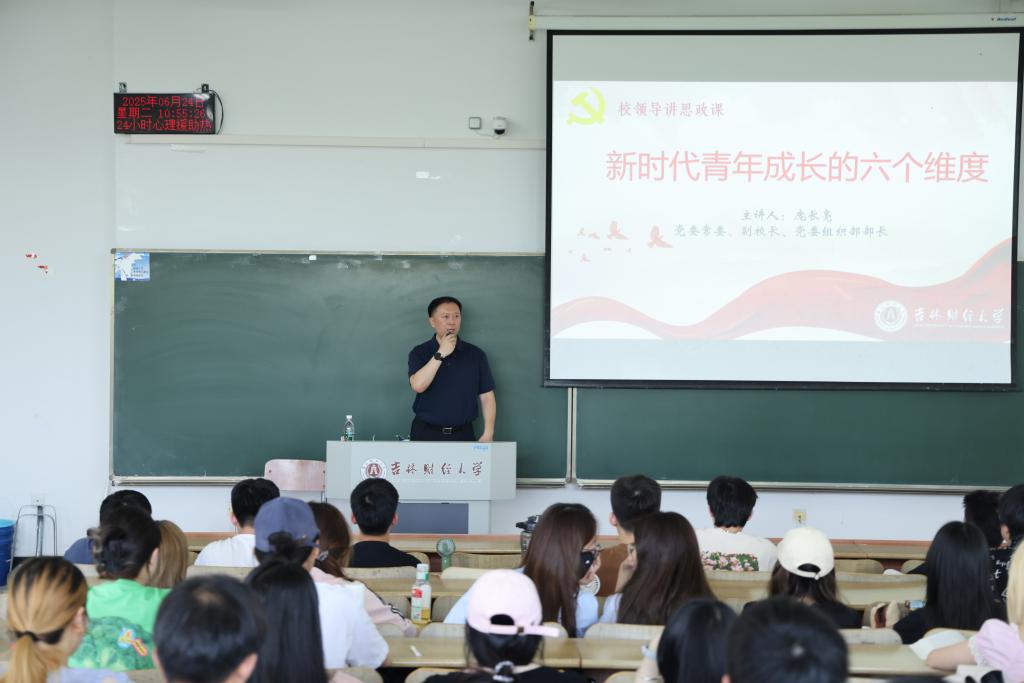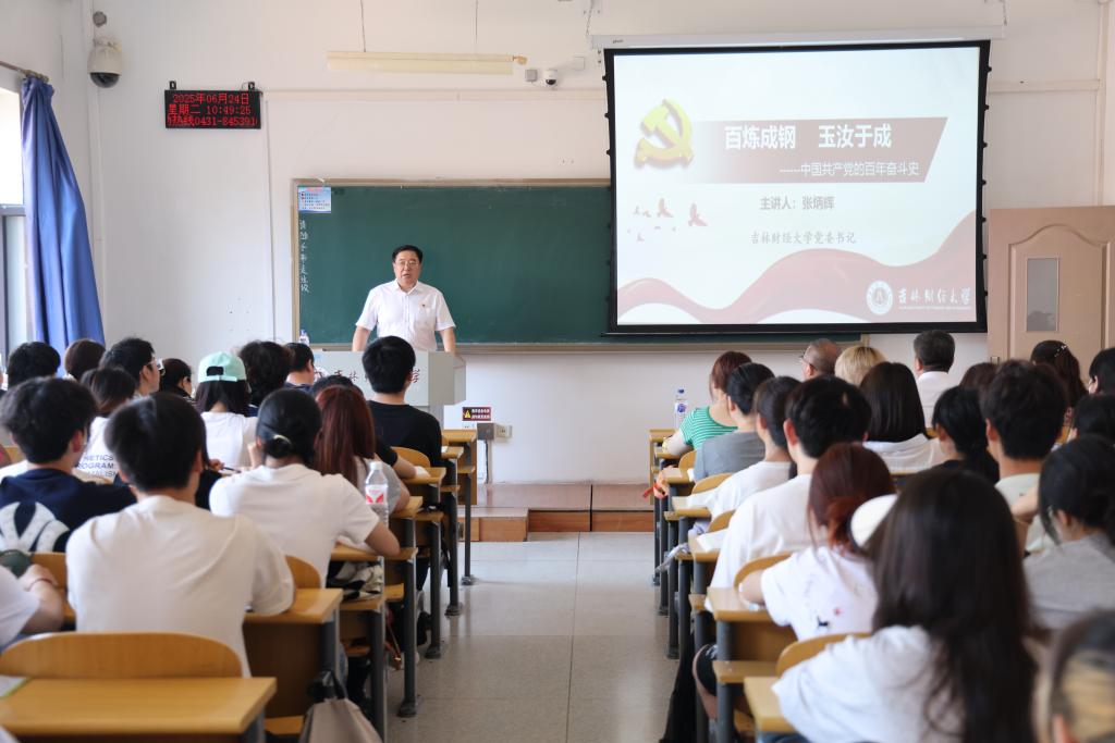 党委书记张炳辉以《百炼成钢 玉汝于成——中国共产党的百年奋斗史》为主题,紧扣“中国共产党为什么能”的主题线索,重点讲述了党史上的三件大事:开天辟地大事变——中国共产党的成立、浴火重生大转折——中国共产党红色政权的建立、继往开来大转移——中国工农红军的长征。从五四运动到一大召开,从南湖扁舟到宝塔山下,从南昌起义到血战湘江,从转战井冈山到扎根陕北,课程坚持政治性和学理性相统一、价值性和知识性相统一,案例“配方”经典、讲述“工艺”精湛,为学生们再现了中国共产党波澜壮阔的革命历程,使他们更加明确了历史和人民选择中国共产党的领导是历史的必然。张炳辉在课堂上强调,作为百年大党,“其作始也简,其将毕也必巨。”中国共产党之“大”,是有人民至上的大情怀,是有勇于奋斗的大气魄,是有不忘初心的大视野,是有造福人类的大担当。高校思政课是立德树人的关键课程,要用好学校思政课主渠道,推动党的历史更好进教材、进课堂、进头脑。吉财学子一定要传承红色基因、建功新时代,在学史明理、学史增信、学史崇德、学史力行方面取得更大成绩!
