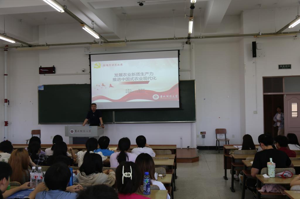 副校长祝国平以《发展农业新质生产力 推进中国式农业现代化》为主题,结合多年来对农村金融、农村经济的研究,从中国式农业现代化的特征、东北地区实现农业现代化的重要意义、农业新质生产力的作用三个方面展开讲解,引领学生深刻理解了马克思主义的人民性特征、人与自然和谐共生、社会主义在实践中开拓进取等相关中国式农业现代化的核心内容。祝国平强调,以人民为中心是党守初心担使命的宝贵经验,习近平总书记坚持把解决好“三农”问题作为全党工作重中之重,举全党全社会之力推动乡村振兴。