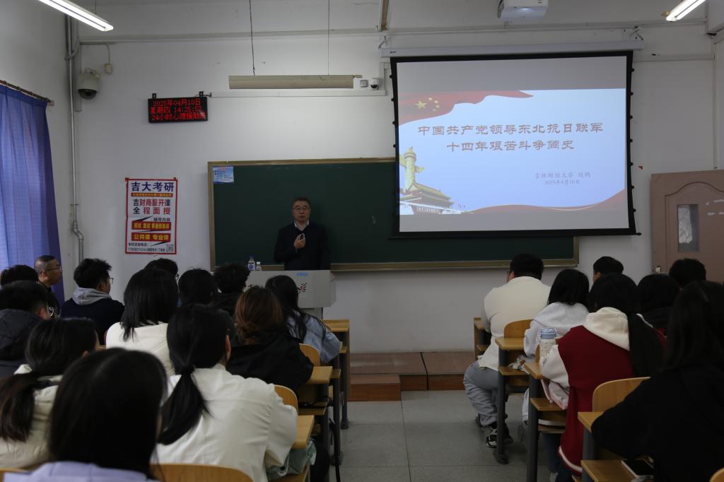 党委副书记刘鹤以《中国共产党领导东北抗日联军十四年艰苦斗争简史》为主题,重点讲述了东北抗日联军为东北和全国抗日战争的胜利做出的重要贡献,回顾了中国人民不畏强暴、以身殉国的杰出代表杨靖宇、赵尚志、赵一曼等烈士们的英勇事迹和牺牲精神。刘鹤强调,东北抗联精神在今天仍然具有重要的现实意义,作为新时代大学生更要努力传承和弘扬。