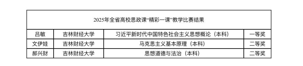 本网讯(马克思主义学院 供稿)近日,吉林省教育厅公布了2025年全省高校思政课“精彩一课”教学成果展示获奖名单,马克思主义学院教师吕敏荣获一等奖,文伊娃、郝兴财荣获二等奖。