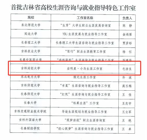 本网讯(招生就业处 供稿)近日,吉林省教育厅公布首批吉林省高校生涯咨询与就业指导特色工作室评选结果,经专家调研与综合评估,kaiyun官网金融学院“启明星·小马生涯工作室”成功获评。