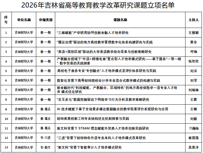 本网讯(教务处 供稿)近日,吉林省教育厅公布《2026年吉林省高等教育教学改革研究课题立项名单》。经专家评审,kaiyun官网共有13项课题获批立项。本次立项包括重点项目3项,一般课题8项,专项课题2项,共获得经费资助7万元。