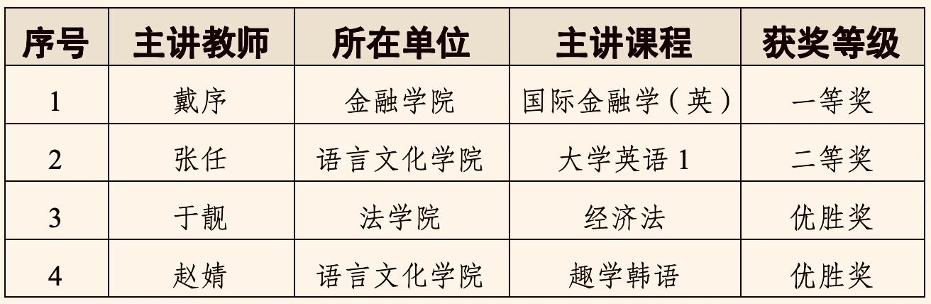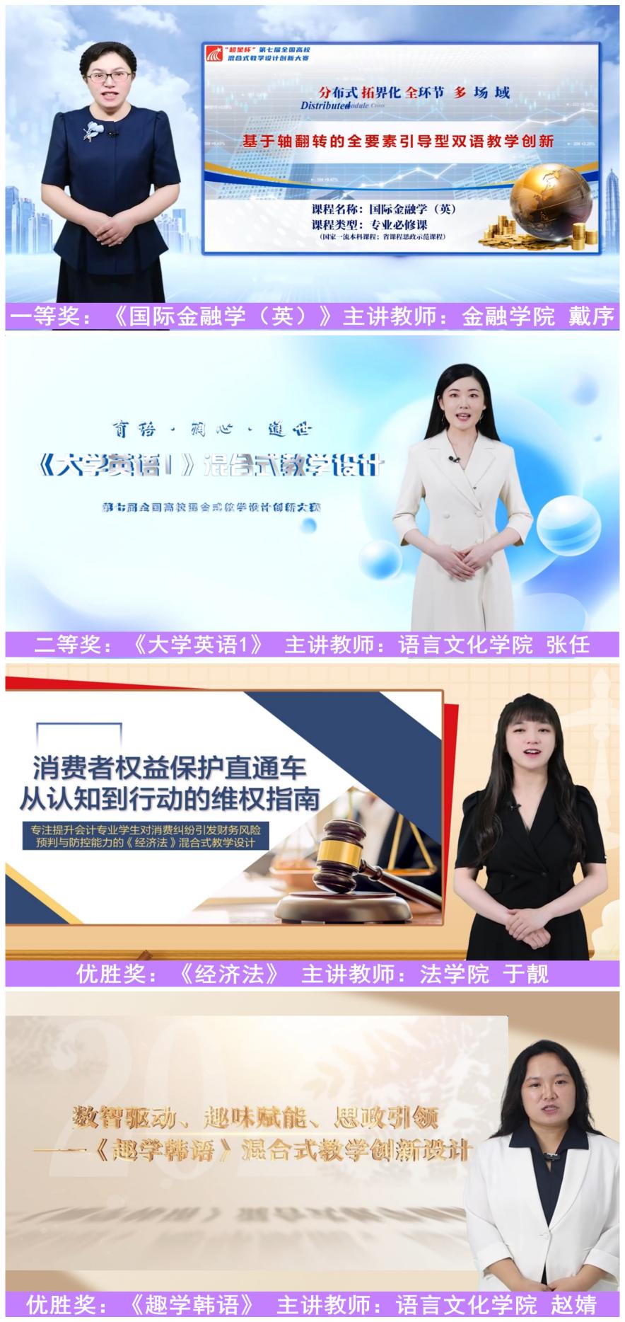 本网讯(教师教学发展中心 供稿)近日,在“超星杯”第七届全国高校混合式教学设计创新大赛上,kaiyun官网金融学院戴序荣获一等奖,语言文化学院张任荣获二等奖,法学院于靓、语言文化学院赵婧等2位教师荣获优胜奖。