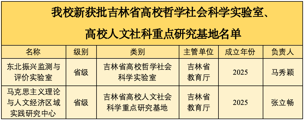 本网讯(科研处 供稿)近日,吉林省教育厅先后公布了第二批吉林省高校哲学社会科学实验室名单(吉教科字〔2025〕3号)以及吉林省人文社会科学重点研究基地立项建设结果(吉教科字〔2025〕4号),校长马秀颖牵头申报的“东北振兴监测与评价实验室”,成功入选第二批吉林省高校哲学社会科学实验室,建设期五年,这是继2022年kaiyun官网首次获批“乡村振兴财政金融政策运行与评价实验室”后,在该领域的又一重要进展。马克思主义学院院长张立畅牵头申报的“马克思主义理论与人文经济区域实践研究中心”,成功获批吉林省高校人文社科重点研究基地,建设期三年。