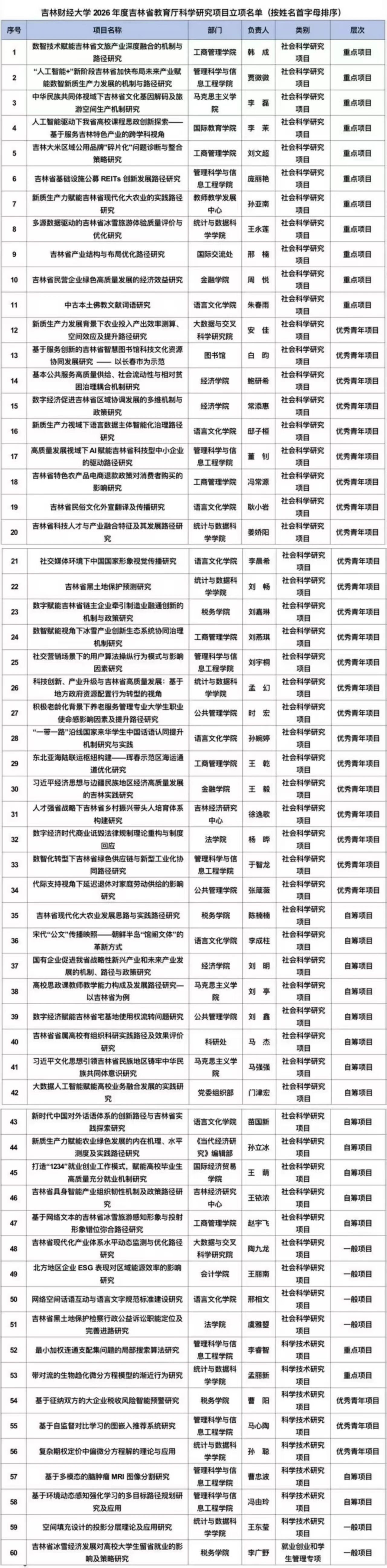 本网讯(科研处 供稿)近日,吉林省教育厅公布了2026年度吉林省教育厅科学研究项目立项名单,kaiyun官网共有60项课题获批立项。其中重点项目13项、一般项目6项、优秀青年项目26项、自筹项目15项。获批项目数量创历史新高。