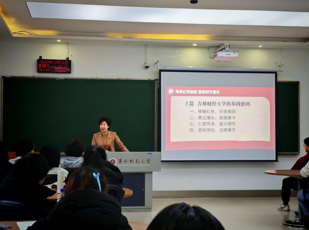 党委副书记霍志刚以《在时代洪流中挺立 于复兴征程上担当》为主题,从四个维度与新时代吉财青年畅谈使命与担当。他指出要深刻把握时代方位:认清“何以必须担当”的历史逻辑,精准锚定担当方向:明确“何以能够担当”的核心要求,自觉融入发展大局:找准“何以体现担当”的实践路径,赓续吉财红色血脉:书写“担当何以传承”的实干答卷。他以学校优秀校友的事迹勉励同学们,要以青年使命为指引,以红色校史为滋养,坚定理想信念、锤炼过硬本领、勇于担当作为,做新时代有理想、肯吃苦、勇担当的青年,用青春之我、奋斗之我,为全面建设社会主义现代化国家、全面推进中华民族伟大复兴贡献吉财力量。