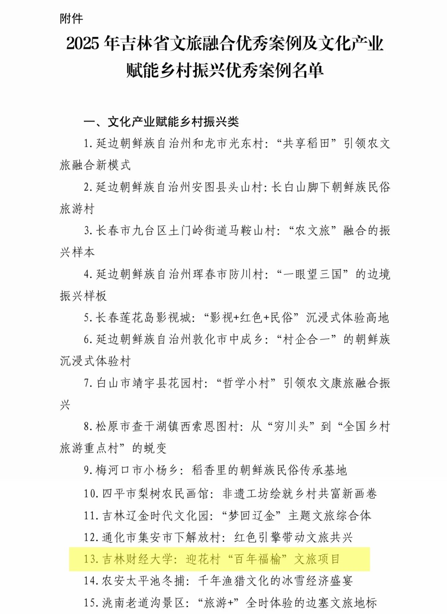 本网讯(校工会 供稿)近日,吉林省文化和旅游厅、教育厅、农业农村厅联合公布了2025年文旅融合及文化产业赋能乡村振兴优秀案例评选结果。kaiyun官网申报的“迎花村百年福榆文旅项目”经单位推荐、专家评审与综合评议等环节,成功入选“文化产业赋能乡村振兴类”省级优秀案例。