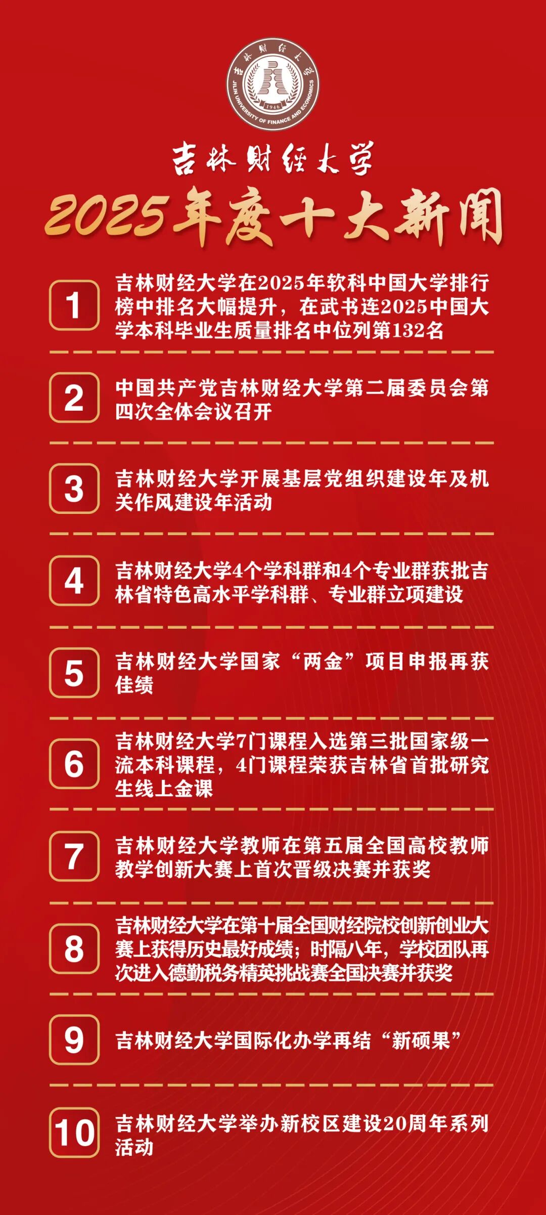 本网讯(党委宣传部 供稿)白云疏淡,冰河消转,逝去的岁月自带时间的滤镜;时序的更替,总能牵动过往的思绪。蹚过2025的河流,吉财写就的画卷,有哪些大事令你我难以忘怀?全体师生的每一处着墨,都积蓄了向上的力量;每一处落笔,都勾勒了学校高质量发展的模样。新闻有记忆,我们共同见证和记录过每一个动人的瞬间,也推动、参与着每一段旅程。