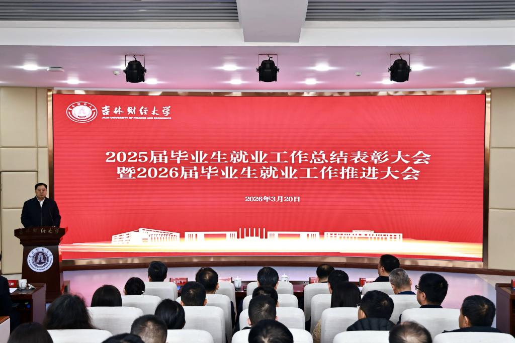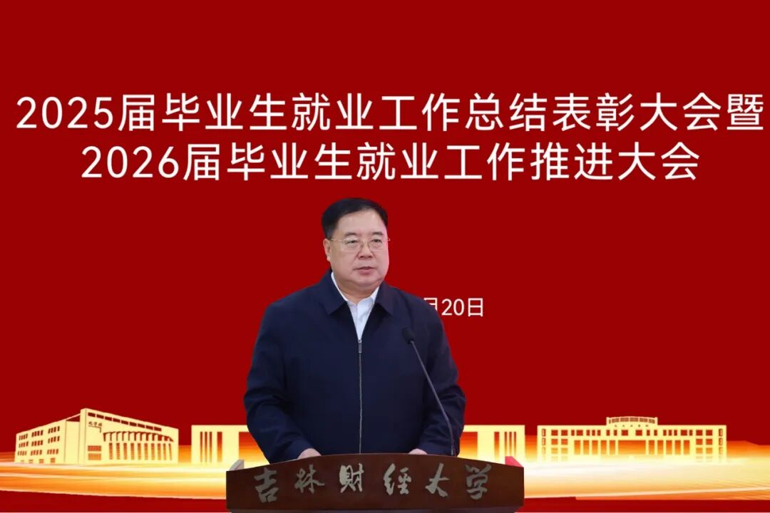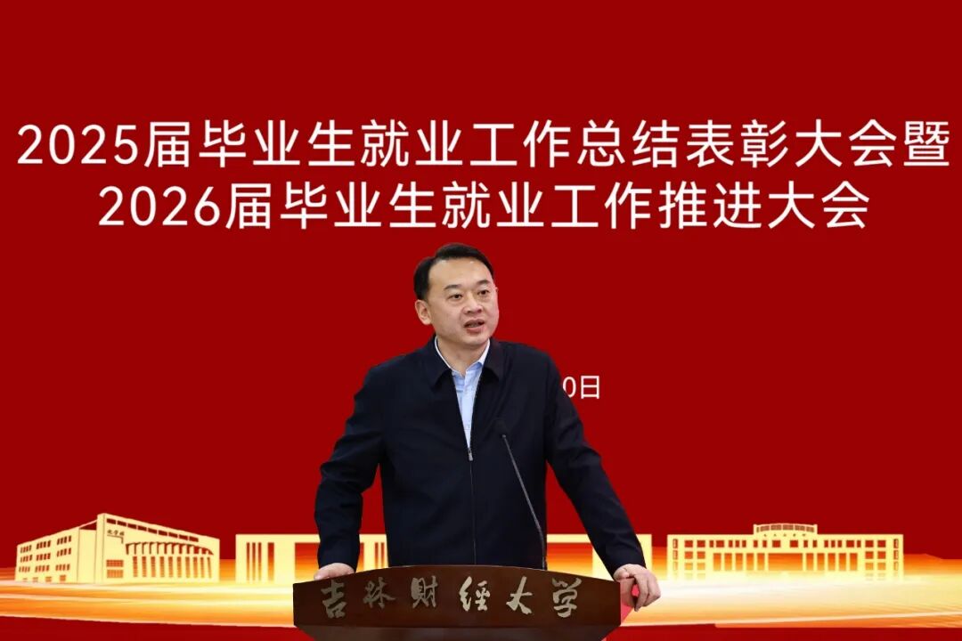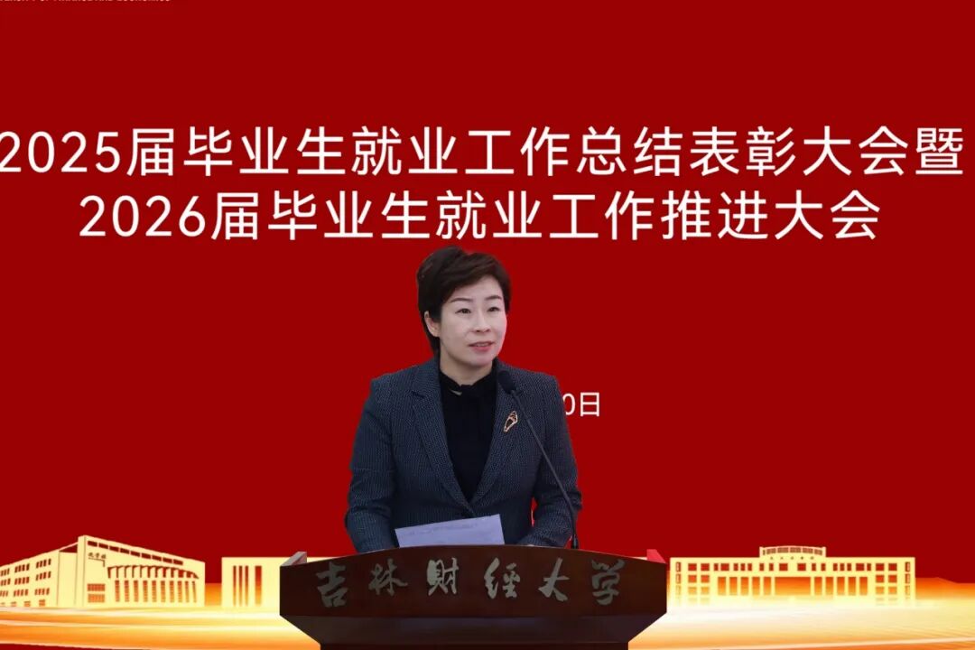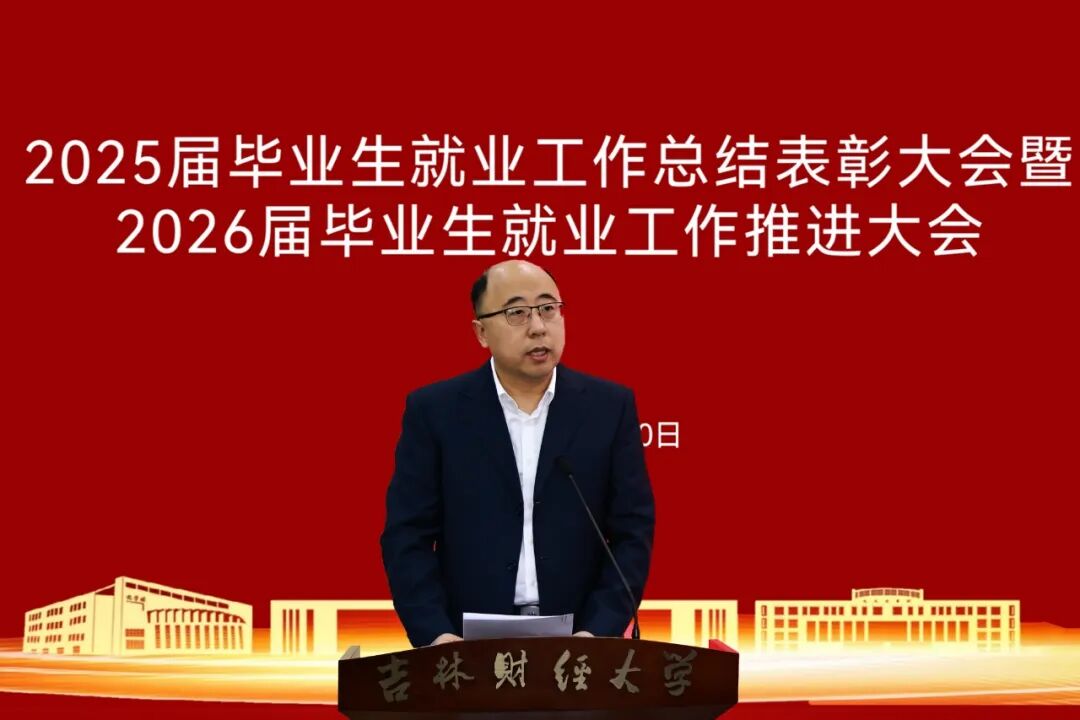 招生就业处处长竭岸扬汇报学校2025年就业工作情况,并结合教育部《2026届高校毕业生就业扩容提质行动方案》和《2026届吉林省高校毕业生就业创业增量提质实施方案》要求,就学校2026届毕业生就业工作的重点任务进行解读。
