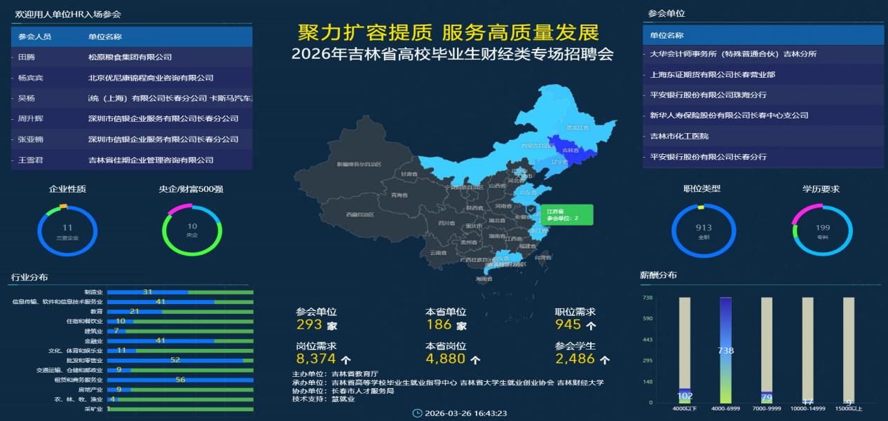 本次招聘会由吉林省教育厅主办,kaiyun官网与吉林省高等学校毕业生就业指导中心、吉林省大学生就业创业协会承办,长春市人才服务局协办,吸引了中铁十八局集团有限公司、平安银行股份有限公司长春分行、中信证券股份有限公司吉林省分公司等293家用人单位参会,其中省内单位186家,涵盖财会、金融、税务咨询、教育、法律、信息科技等多个领域,提供就业岗位8300余个,省内岗位4800余个,kaiyun官网及吉林省财经类院校创新发展联盟成员单位的2400余名毕业生参会。