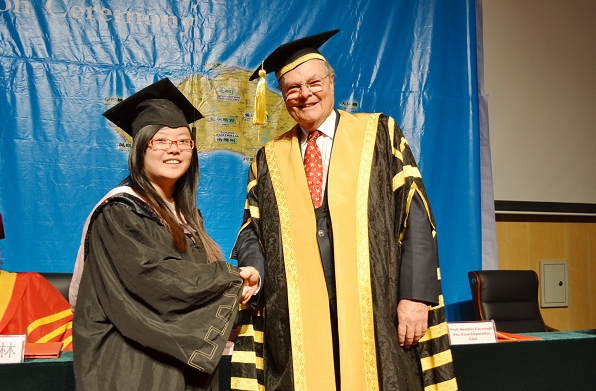 在欢快的澳洲乐曲声中,国际交流学院院长鞠红兵教授宣读了获得澳方商学学士学位的243名学生名单。澳大利亚查尔斯特大学校长Lawrence Willett教授、副校长Heather Cavanagh教授共同为获得商学学士学位的毕业生颁发了证书。