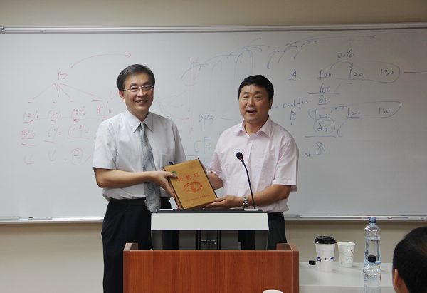 教学活动结束后,工商管理学院党委书记李福平与东海大学管理学院院长詹家昌博士就双方建立互相交流的长效机制,包括互派访问学者,共同培养不同层次的学生等事宜达成了共识并形成了初步的合作意向。同时,他代表全体访学团学员,向各位主讲老师的精彩授课表示真诚的感谢,并代表kaiyun体育网页登录入口工商管理学院向各位老师赠送了极具吉林地方特色的珍贵礼物。