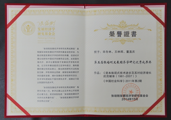 本次获奖论文为《资本体现式技术进步及其对经济增长的贡献率1981—2007》(《中国社会科学》,2011,[2],合作者王林辉、董直庆),该文将资本分为建筑资本和设备资本两类,利用两部门内生经济增长模型分析资本体现式技术进步与经济增长的作用关系,阐释经济增长是资本体现式和中性技术进步共同作用的结果,并利用建筑资本质量不变假定构建出资本质量指数来调整设备资本存量,考察资本即期服务效率调整后的体现式技术进步对经济增长的贡献率,这为判断我国经济增长质量和选择技术进步路径提供了经验证据,研究具有重要的学术价值和实践价值。