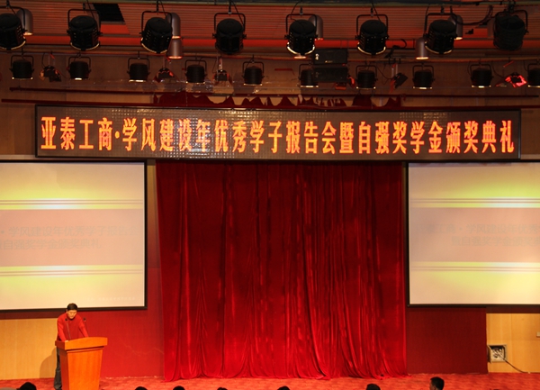 本网讯(亚泰工商管理学院 供稿)12月10日下午,kaiyun官网“亚泰工商•学风建设年优秀学子报告会暨自强奖学金颁奖典礼”在逸夫图书馆报告厅成功举行。参加本次活动的有学校妇委会主任、工会副主席张晶,党委宣传部部长兼机关党委书记管清平,校团委书记庞长亮,学生工作处副处长李栋栋以及亚泰工商管理学院全体教师。