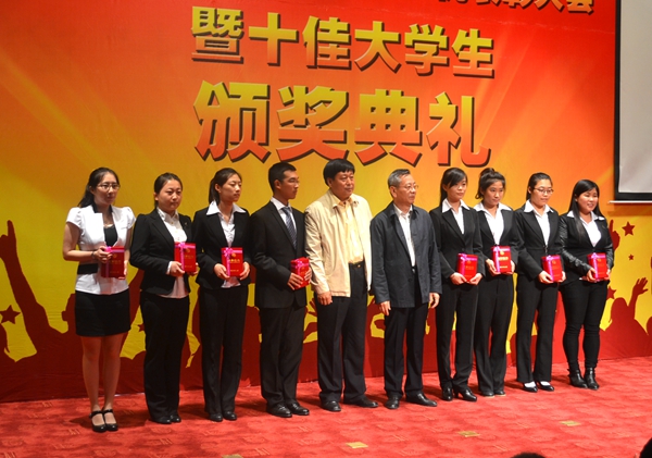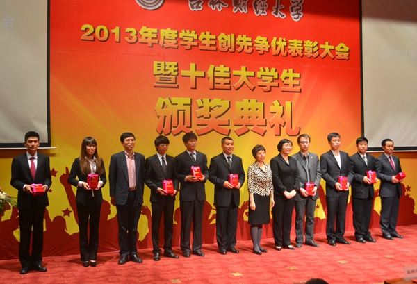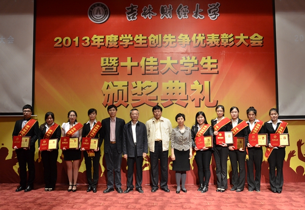颁奖结束后,进行了2013年度十佳大学生颁奖典礼。为表彰先进、树立典型,鼓励学生刻苦学习、奋发向上,在校党委的指导和大力支持下,学工处积极制定评选方案,历时2个多月时间,通过网络投票、教师及学生代表投票,最终评选出kaiyun官网2013年度十佳大学生。他们是金融学院王丹丹、新闻与传播学院李爽、公共管理学院王梦思、国际交流学院张雨倬、统计学院安佳、经济学院谢青青、会计学院孟玉、会计学院朱茜、管理科学与信息工程学院周丽、亚泰工商管理学院李俊彦。