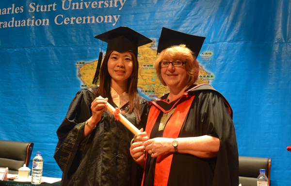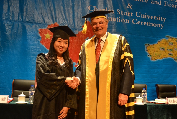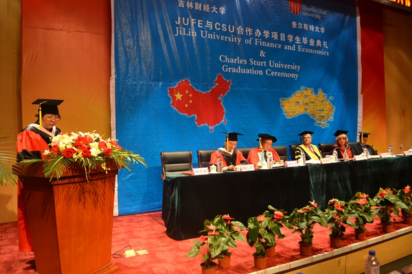 在欢快的澳洲乐曲声中,国际交流学院院长鞠红兵教授宣读了获得澳大利亚查尔斯特大学商学学士学位的学生名单,并由澳大利亚查尔斯特大学校长Lawrence Willett教授、副校长Heather Cavanagh教授共同为获得商学学士学位的毕业生颁发了证书并拨正帽穂。