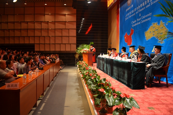 毕业典礼由副院长韩岳峰副教授主持。学位授予仪式暨毕业典礼,在中华人民共和国国歌和澳大利亚国歌中正式开始。首先由副校长杨春梅教授致辞,她向远道而来的客人和学生家长表示热烈的欢迎,代表学校向获得澳方商学学士学位的同学表示衷心的祝贺。在致辞中,杨校长鼓励毕业生要学无止境,追求卓越。希望同学们铭记“明德崇实”之校训,诚实做人,踏实做事;希望同学们能够抓住机遇,奋发图强,锐意进取:希望毕业生心系师生情谊,保持与母校联系,关注母校发展。随后,澳大利亚查尔斯特大学校长Lawrence Willett教授发表了热情洋溢的讲话。他表达了自己对2014届毕业生美好的祝愿,希望两校的合作办学更加紧密、前景更加美好。