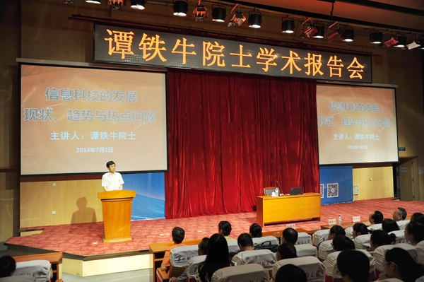 随后,谭院士为与会师生做《信息科技的发展:现状、趋势与热点问题》专题学术报告。谭院士的报告分为世界科技革命简要回顾、信息社会与信息技术、信息科技发展的基本现状、信息科技发展的主要趋势以及信息科技值得关注的10个热点问题五个部分。谭院士首先指出科技革命深刻影响和改变着民族的兴衰和国家的命运,新一轮的科技革命和产业革命正在孕育和兴起,我国应抓住机遇发展信息科技。接下来,他通过具体实例讲解了信息社会与信息技术的概念及应用范围,并将信息科技发展的基本现状总结为“五新”,即“新阶段、新瓶颈、新变革、新挑战、新前沿”;将信息科技发展的主要趋势总结为“五化”,即“泛在化、智能化、虚拟化、融合化、绿色化”。随后,他提出并解释了包括下一代互联网、物联网、网络安全、云计算、大数据等信息科技值得关注的热点问题。最后,谭院士强调,信息化浪潮方兴未艾,信息科技将继续引领人类文明的进程,信息科技仍然存在巨大的的创新空间和广阔的产业前景。