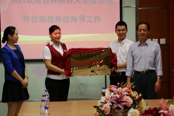 在长春农商银行卫星广场支行的工作人员介绍其企业文化及发展后,双方就共建实习基地相关事宜进行了洽谈并达成共识,税务学院党委书记曲晓东与朱静经理共同为共建实习基地进行揭牌。之后曲晓东书记与马屹行长分别作了讲话。双方本着优势互补,工作互动的原则,为即将走出大学校门的学生搭建实习平台,学习银行实务课程,帮助大四学生从学校向社会平稳过渡。