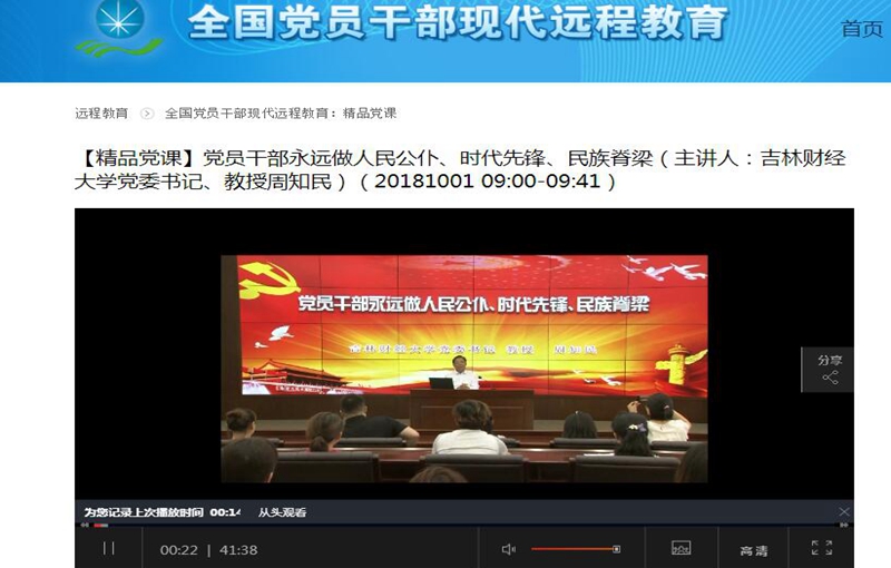 本网讯 经中央组织部严格审核,校党委书记周知民教授主讲的专题党课《党员干部永远做人民公仆、时代先锋、民族脊梁》成功入选全国“精品党课”,已经在中组部全国党员干部现代远程教育直播频道“精品党课”栏目中播出,而且将同步上线中组部共产党员网“精品党课”栏目。目前,党课的精彩视频已上传至“新时代e支部”云课堂“党课”栏目。
