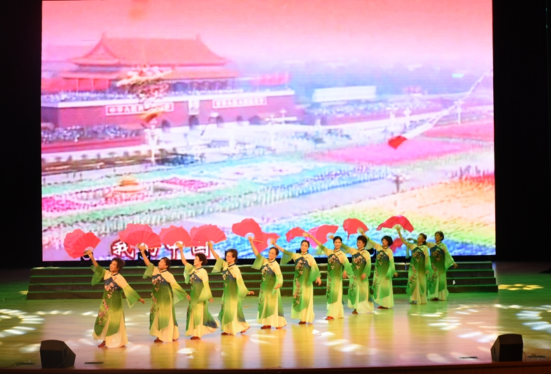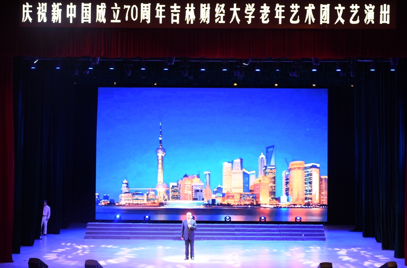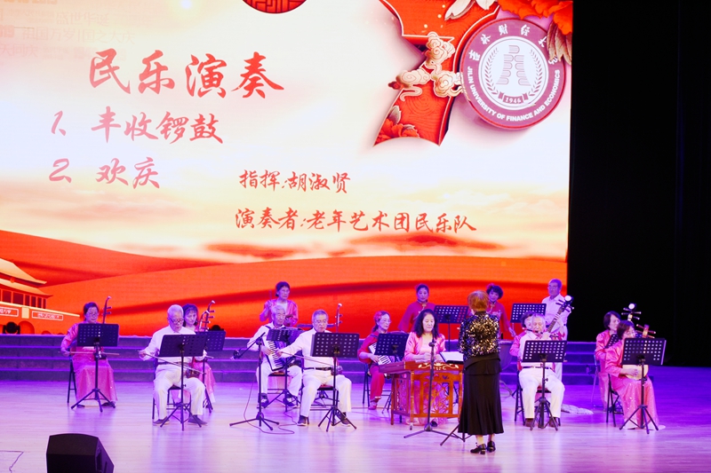 接下来,表演正式开始。由胡淑贤指挥、老年艺术团民乐队演奏的《丰收锣鼓》《欢庆》拉开此次表演的序幕。由牛文静指导,周尚荣、温波等为主要演员的艺术团舞蹈队表演的舞蹈《大美吉林》表现了吉林的大气之美。由王国庆原创,马琳、郝中华、朱泉、王庆国朗诵的《颂歌献给祖国》咏出了对祖国的赞美。由卜昭红、张宝环演唱的京剧选段《中国脊梁》唱出了中国的气魄。由胡淑贤演奏,蔡海玲、金淑华等伴舞的萨克斯独奏《梦中的额吉》让人回味无穷。由郝中华、闫恕生等表演的广场舞《敬祝毛主席万寿无疆》让我们看到离退休老同志们饱满的精神面貌。由学生胡双明、杨舒月弹奏的《欢乐进行曲》《神话》流溢出欢乐与美好。由谷玉萍、卜昭红等艺术舞蹈队表演的舞蹈《今天是你的生日,我的中国》舞出了满堂的喜悦。由张桂玲演唱的歌舞秀《江南秀》展示出了江南水乡女子温婉的动人画面。由闫恕生、马琳、潘俊玲等表演的舞蹈《我祝祖国三杯酒》彰显了舞蹈队的恢宏大气。由郭益和朗诵的毛主席诗词《沁园春•雪》气势磅礴。由闫恕生等表演的芦丝、巴乌三重奏《我爱你,中国》让我们沉浸在家国情怀之中。由马琳、周尚荣等表演的旗袍秀《望月》向我们展示了古典服饰旗袍的魅力。由司晨曦、许铭惠等表演的舞蹈《芳华依旧少年时》重现了老年人的活力。由时雨田演唱的《我和我的祖国》沉稳壮美、气贯长虹。最后,以胡淑贤为指挥,张桂玲、黄绍平领唱,边宏伟手风琴伴奏的大合《祝福祖国》《共筑中国梦》将此次演出推向了高潮。