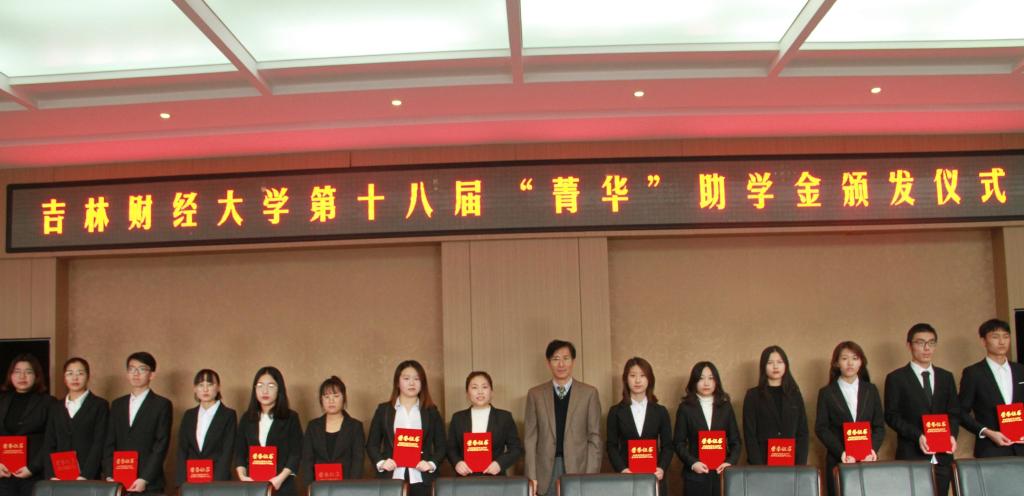 仪式上,黄建东宣读了“菁华”助学基金获奖学生名单。崔少华为受助学生颁发吉财“菁华”助学金、获奖证书以及少华校友亲笔签名的鼓励信。