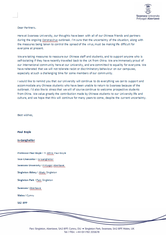 英国斯旺西大学校长保罗· 博伊尔在问候信中写到:虽身处英国,却十分牵挂疫情中的中国朋友和合作伙伴们。斯旺西大学正在采取多项措施帮助因疫情而无法返回英国的中国师生。斯旺西大学承诺:一定会竭尽所能为中国师生提供援助,同时会平等对待每位成员,绝不容忍校园内的歧视行为。他还表示,斯旺西大学非常珍视中国学生对丰富校园文化所做的贡献,将始终欢迎中国学生的到来。