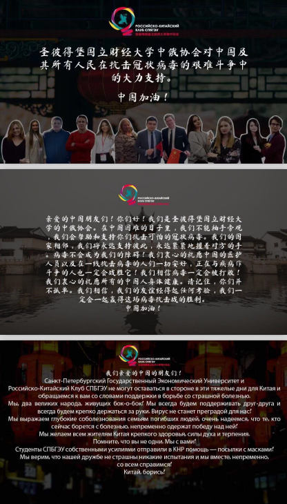 中国-俄罗斯经济类大学联盟俄方牵头单位——俄罗斯圣彼得堡国立财经大学在信中写道:在困难的日子里,我们不能袖手旁观,我们会帮助和支持你们抗击可怕的冠状病毒。我们的国家相邻,我们将永远支持彼此,永远紧紧握着对方的手,病毒不会成为我们的障碍!请记住,你们并不孤单。我们相信,我们的友谊经得起任何考验,我们一定会一起赢得这场病毒抗击战的胜利。中国加油!