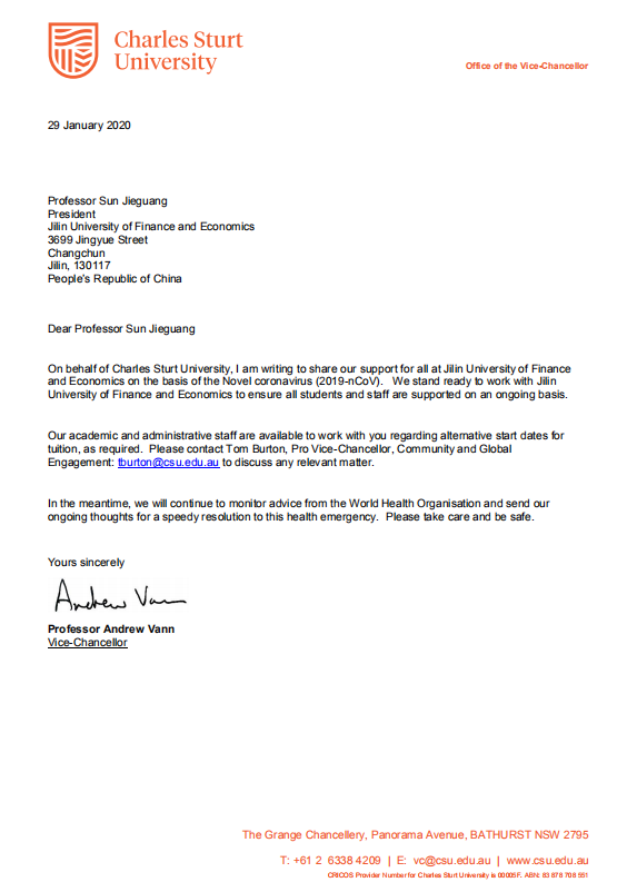 澳大利亚查尔斯特大学校长安德鲁·范恩在信函和视频中表示,查尔斯特大学一直关注着中国的新冠肺炎疫情,对吉财师生表示诚挚的问候与声援。在这个充满挑战的时刻,查尔斯特大学将与吉财并肩合作,尽其所能为吉财师生提供全方位支持。坚信危机会很快过去,双方的关系将更加紧密,祝愿吉财师生平安幸福!