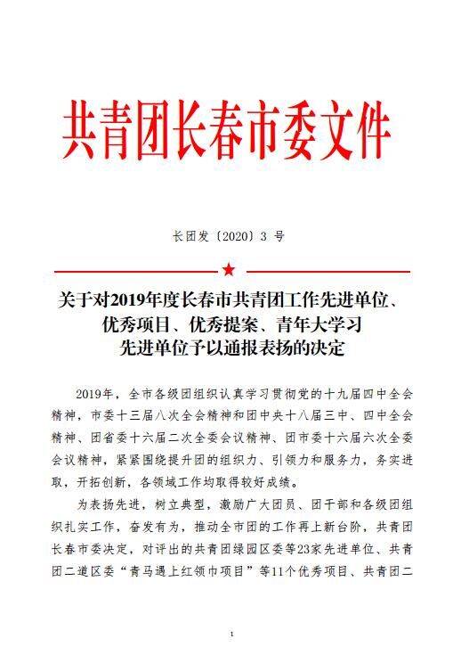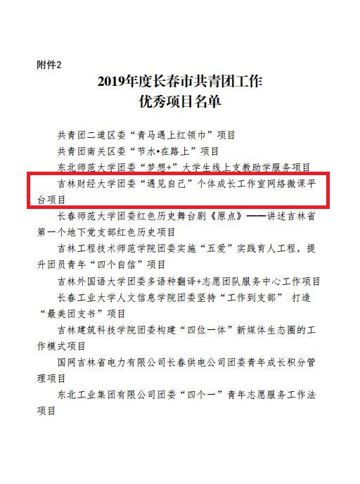 本网讯(校团委 供稿)近日,从团市委传来喜讯,kaiyun官网团委“遇见自己”个体成长网络微课平台项目从300多个项目中脱颖而出,被评为2019年度长春市共青团工作优秀项目,本次共评选出共青团工作优秀项目11个。该平台由国际经济贸易学院团委书记遇言于2019年10月创建,是kaiyun官网团委重点建设的项目之一,旨在为青年学生答疑解惑、助力成长,以青年学生喜欢的方式引领青年、凝聚青年、服务青年。