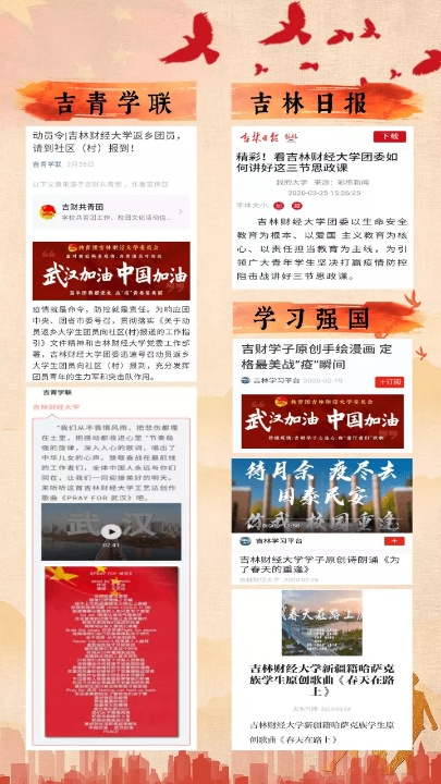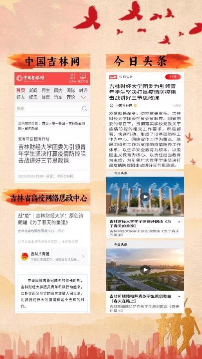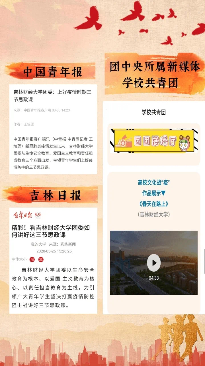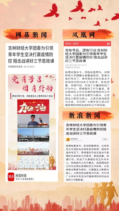 “kaiyun体育网页登录入口团委为引领青年学生坚决打赢疫情防控阻击战讲好三节思政课”的战疫抗疫工作做法在“kaiyun体育网页登录入口”和“吉财共青团”微信平台推出后,引发了社会新闻媒体的广泛关注,先后被中国青年报、团中央所属新媒体、吉林日报、学习强国、中国吉林网、吉林省高校网络思政中心、今日头条、网易、凤凰网、新浪等20余家主流新闻媒体和网络新媒体报道。(审核人 刘成立)