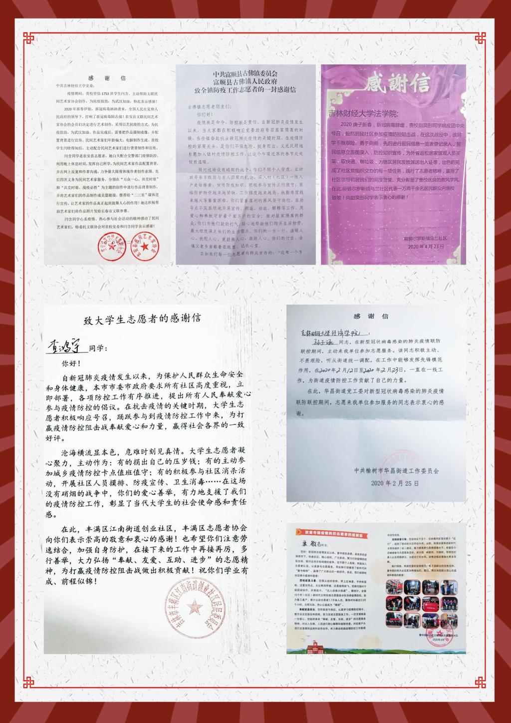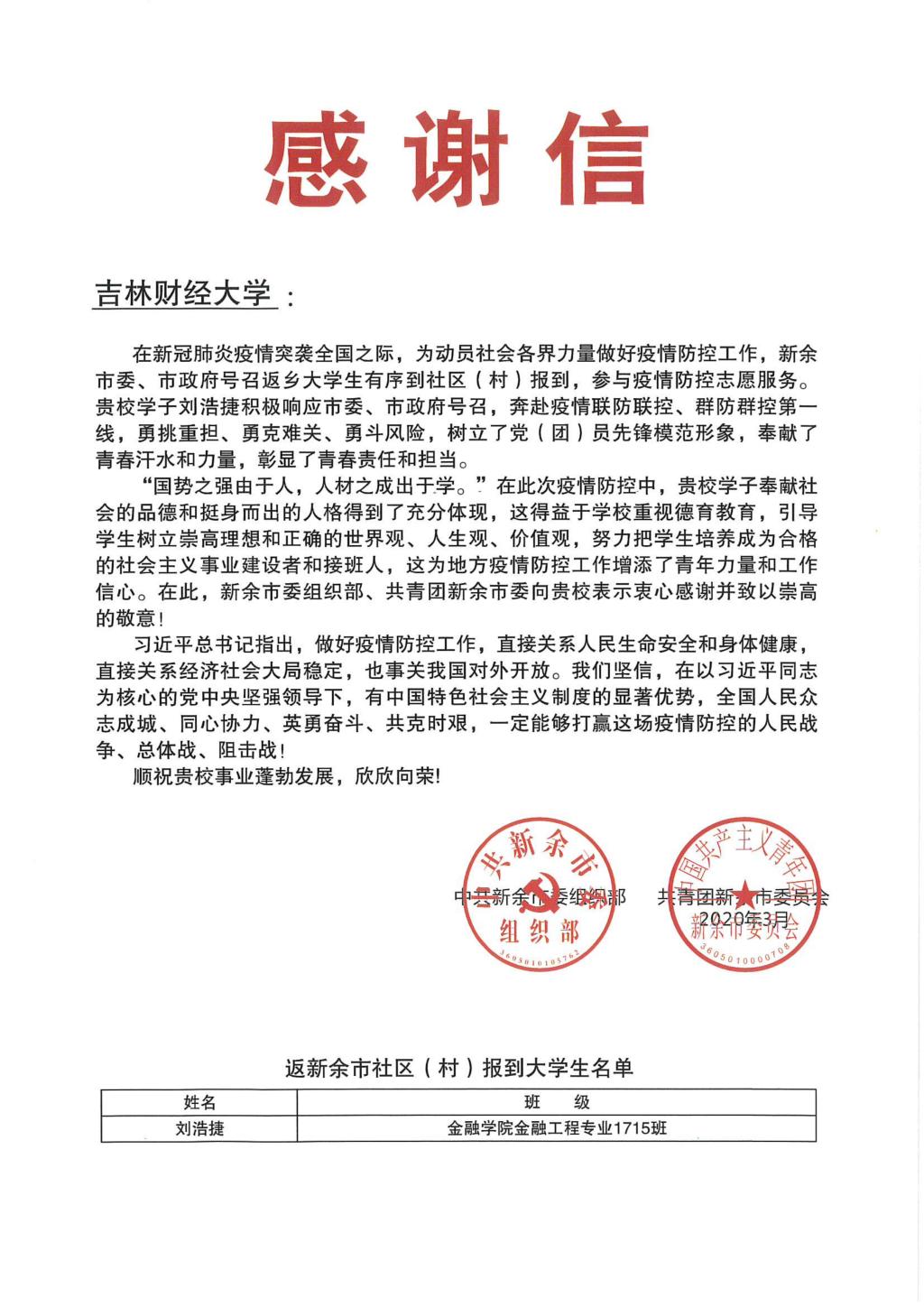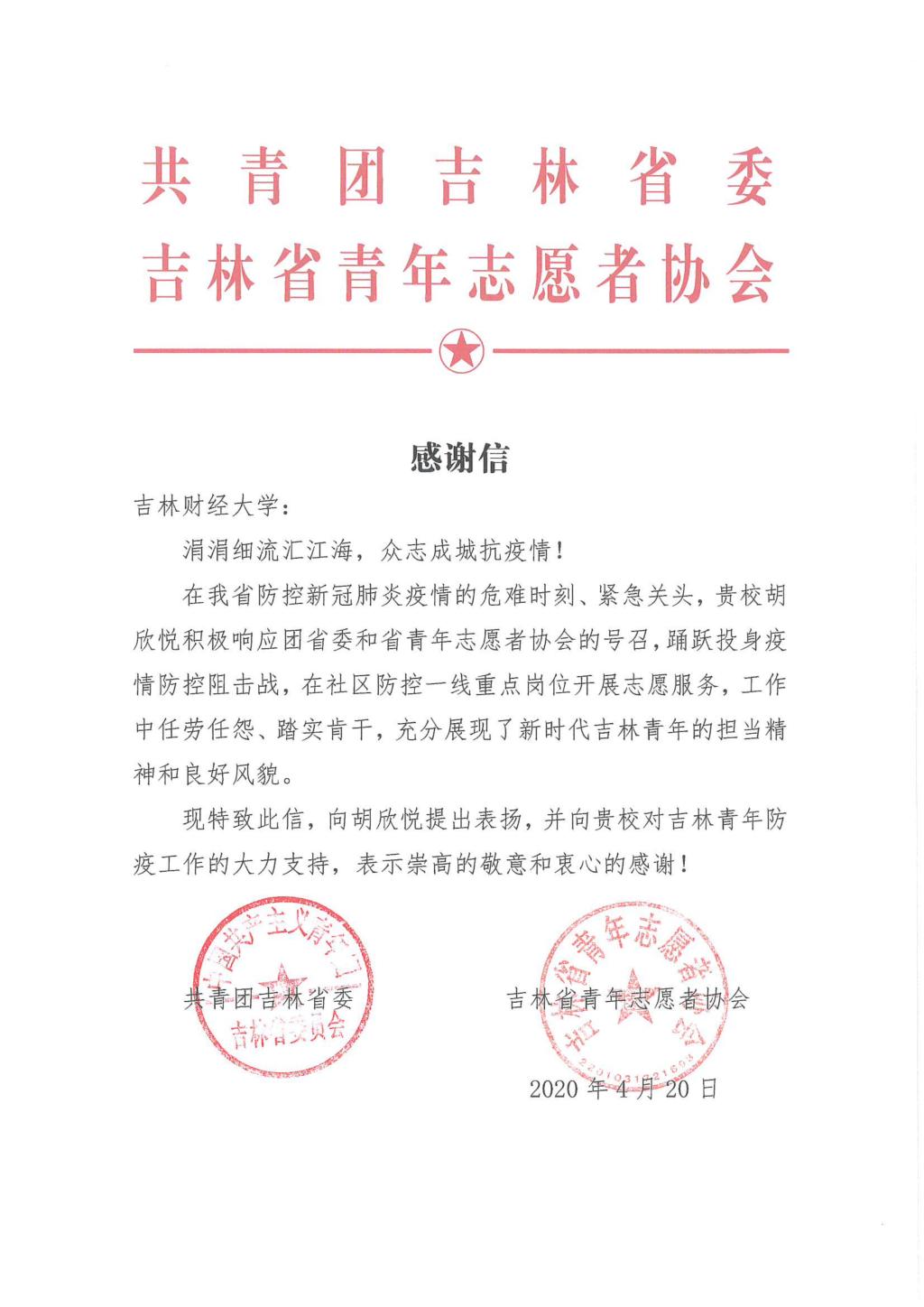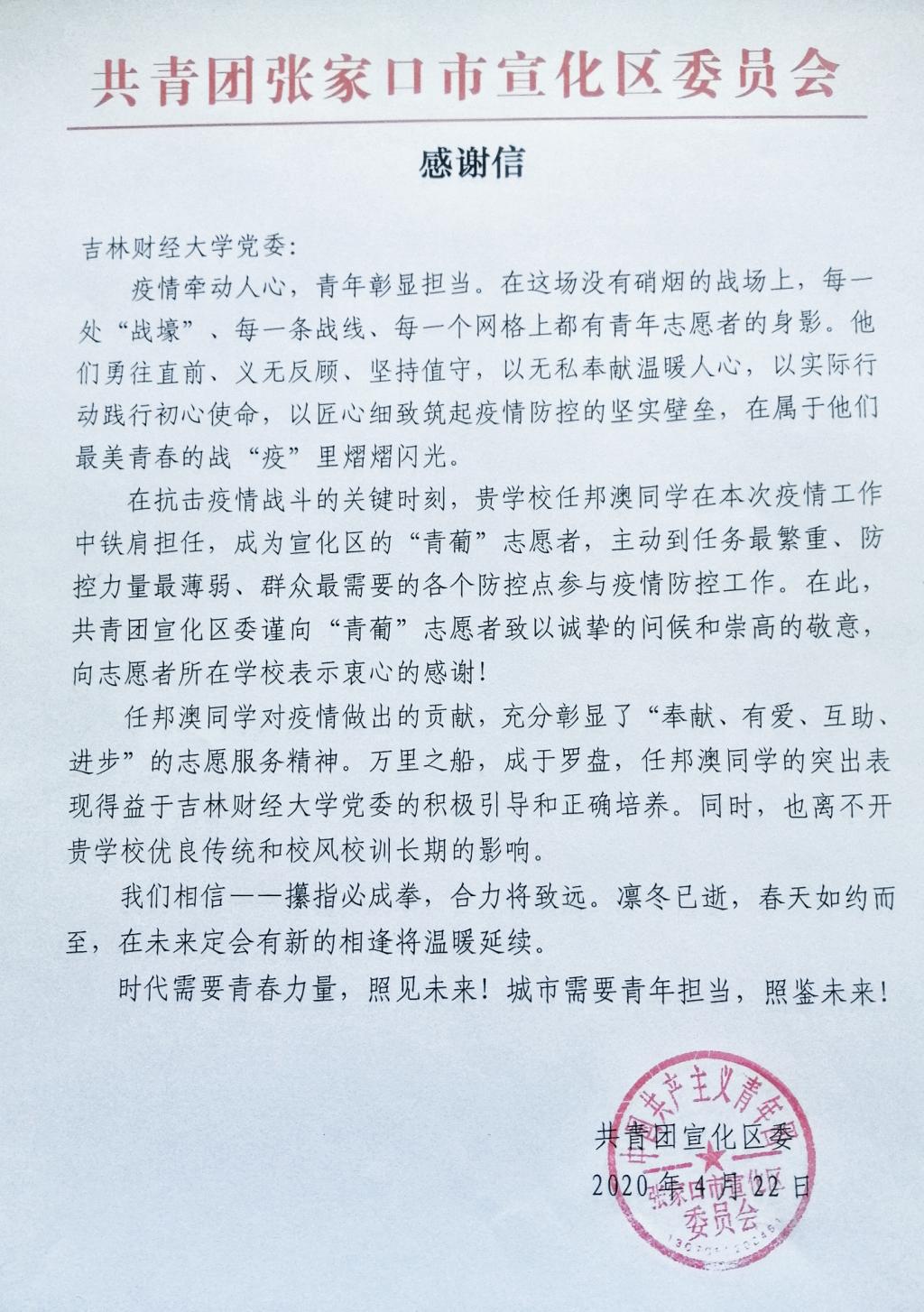本网讯(校团委 供稿)近日,kaiyun官网相继收到共青团吉林省委、吉林省青年志愿者协会、中共新余市委组织部、共青团新余市委员会、阿克苏市新城街道办事处、共青团张家口市宣化区委员会、共青团前郭县委员会、共青团白山市委员会等多家单位感谢信。在信中,各级组织对kaiyun官网在人才培养、思想引领、思政建设等方面工作给予了高度评价,对kaiyun官网学生在打赢疫情防控阻击战过程中勇挑重担、勇克难关、勇斗风险的高贵品质给予了充分肯定。