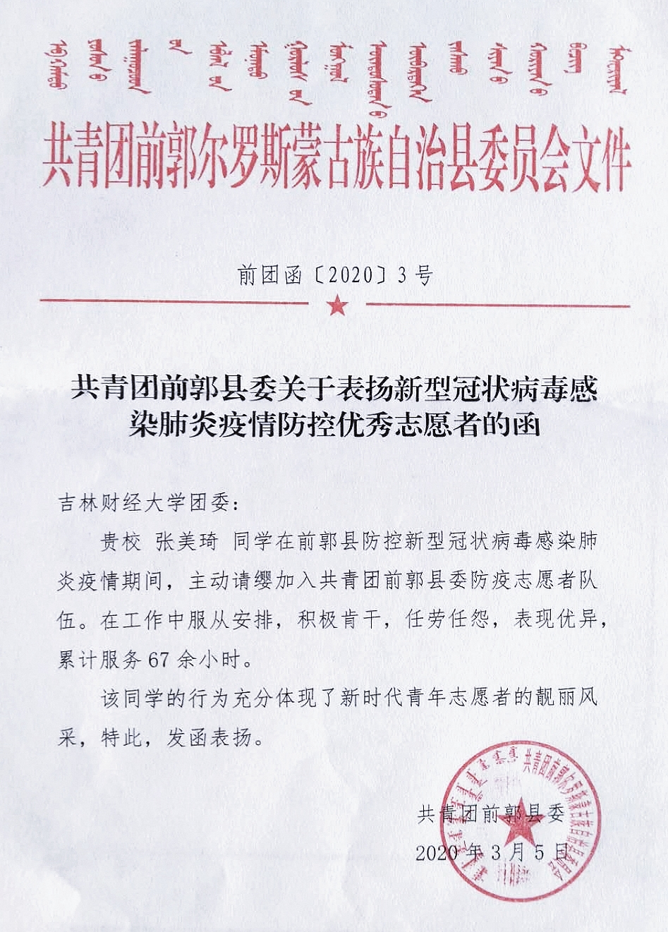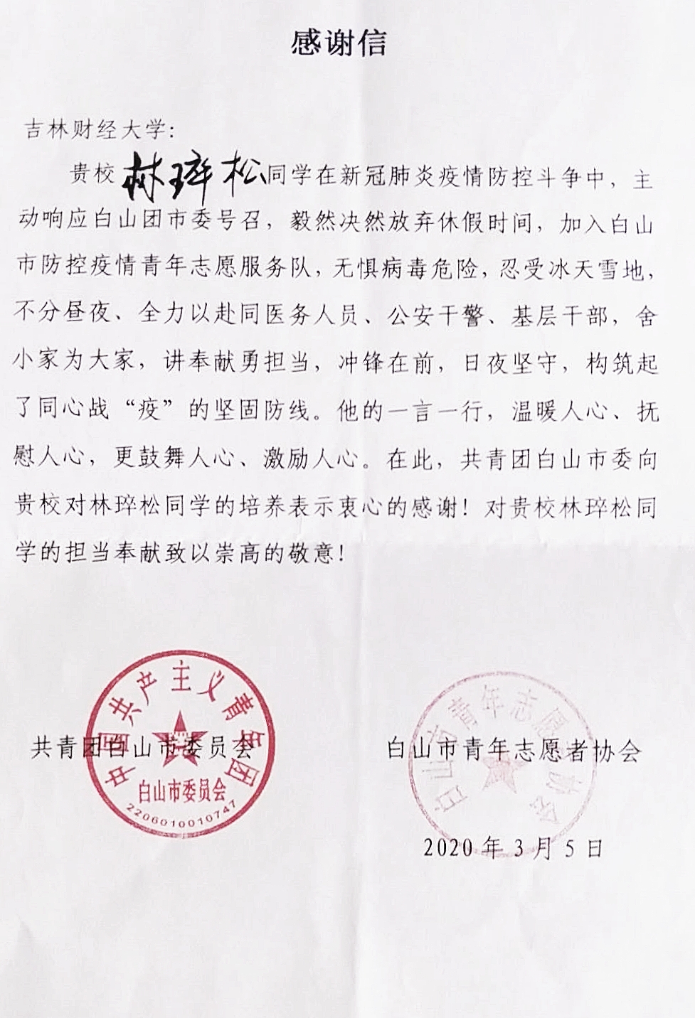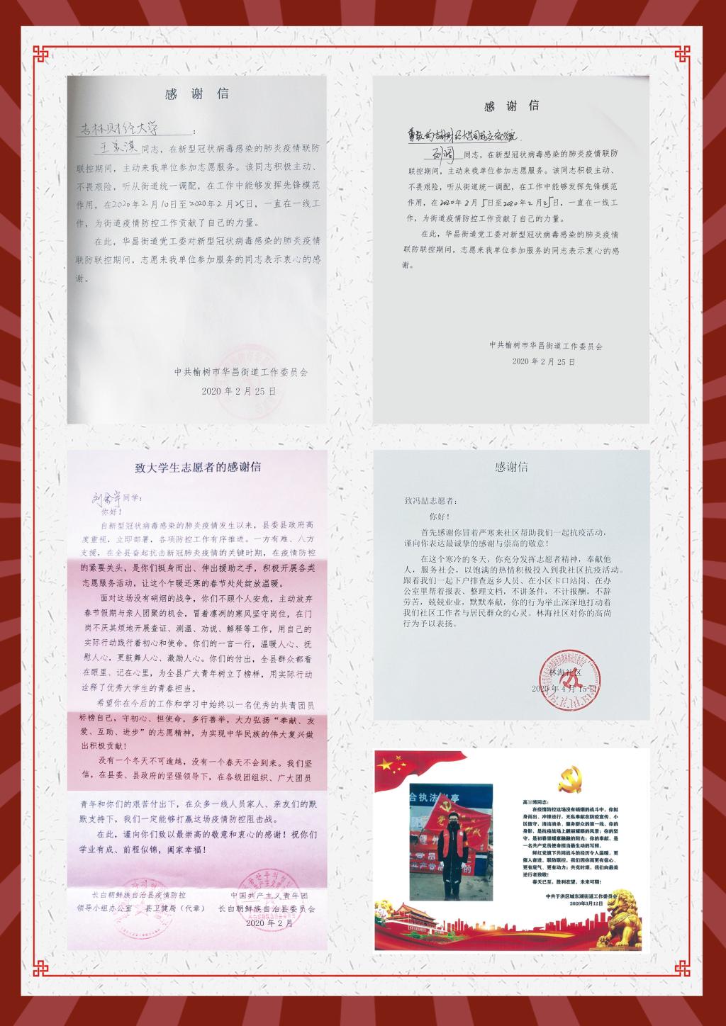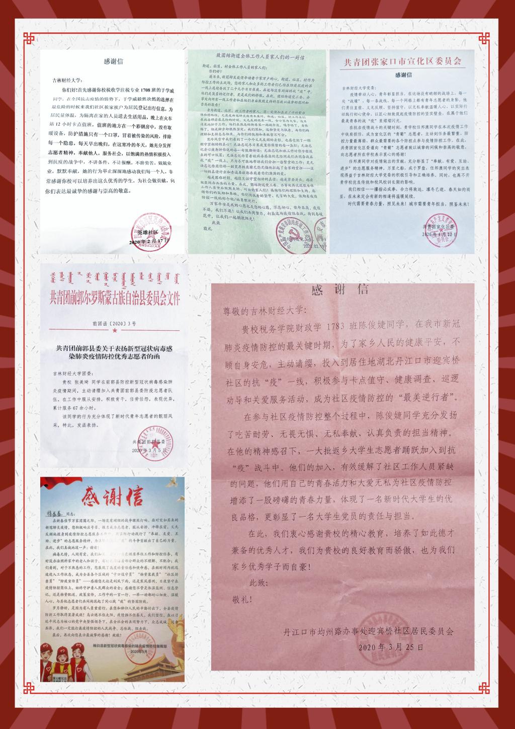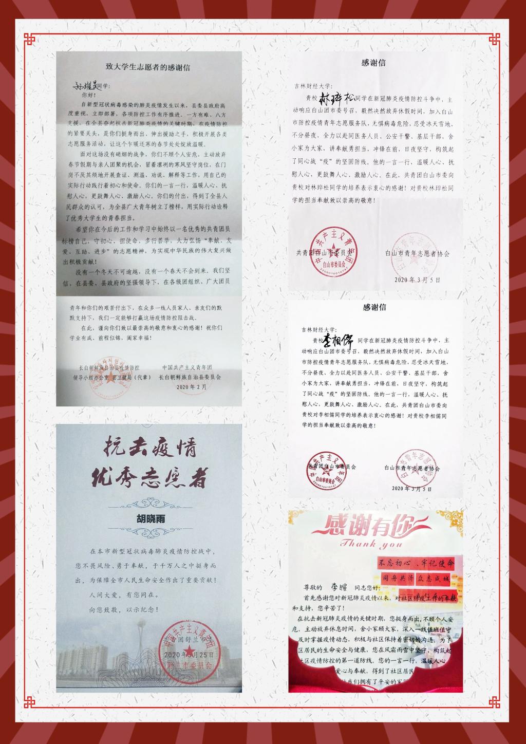 本网讯(校团委 供稿)近日,kaiyun官网相继收到共青团吉林省委、吉林省青年志愿者协会、中共新余市委组织部、共青团新余市委员会、阿克苏市新城街道办事处、共青团张家口市宣化区委员会、共青团前郭县委员会、共青团白山市委员会等多家单位感谢信。在信中,各级组织对kaiyun官网在人才培养、思想引领、思政建设等方面工作给予了高度评价,对kaiyun官网学生在打赢疫情防控阻击战过程中勇挑重担、勇克难关、勇斗风险的高贵品质给予了充分肯定。