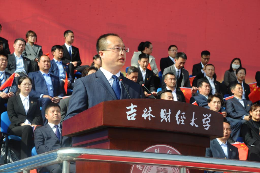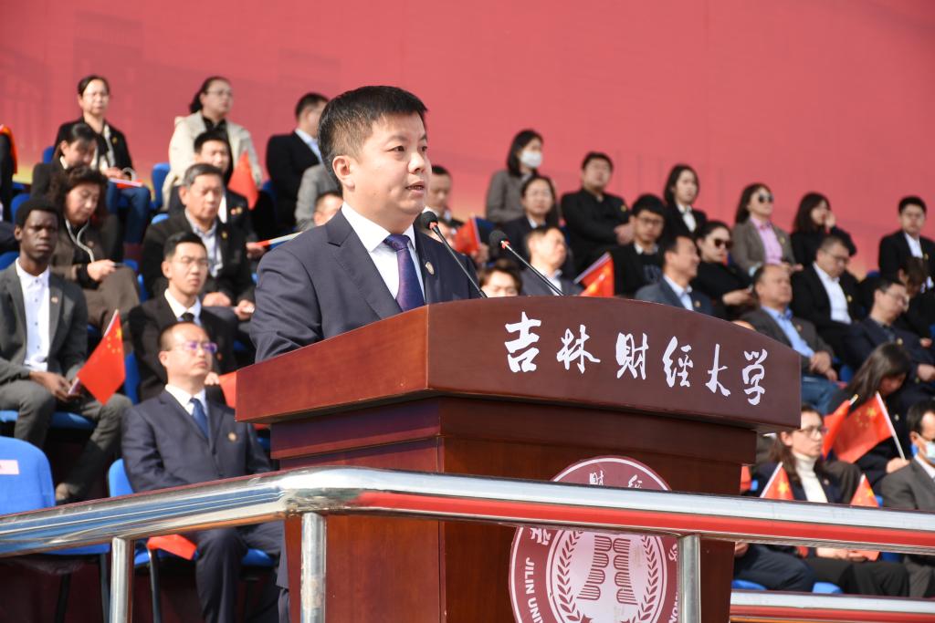 吉林省政府会计咨询专家、吉林省高级会计师评审专家、会计学院院长梁毕明代表全体教师发言,祝愿同学们在大学收获健康、收获友谊、收获梦想,收获属于自己的青春。